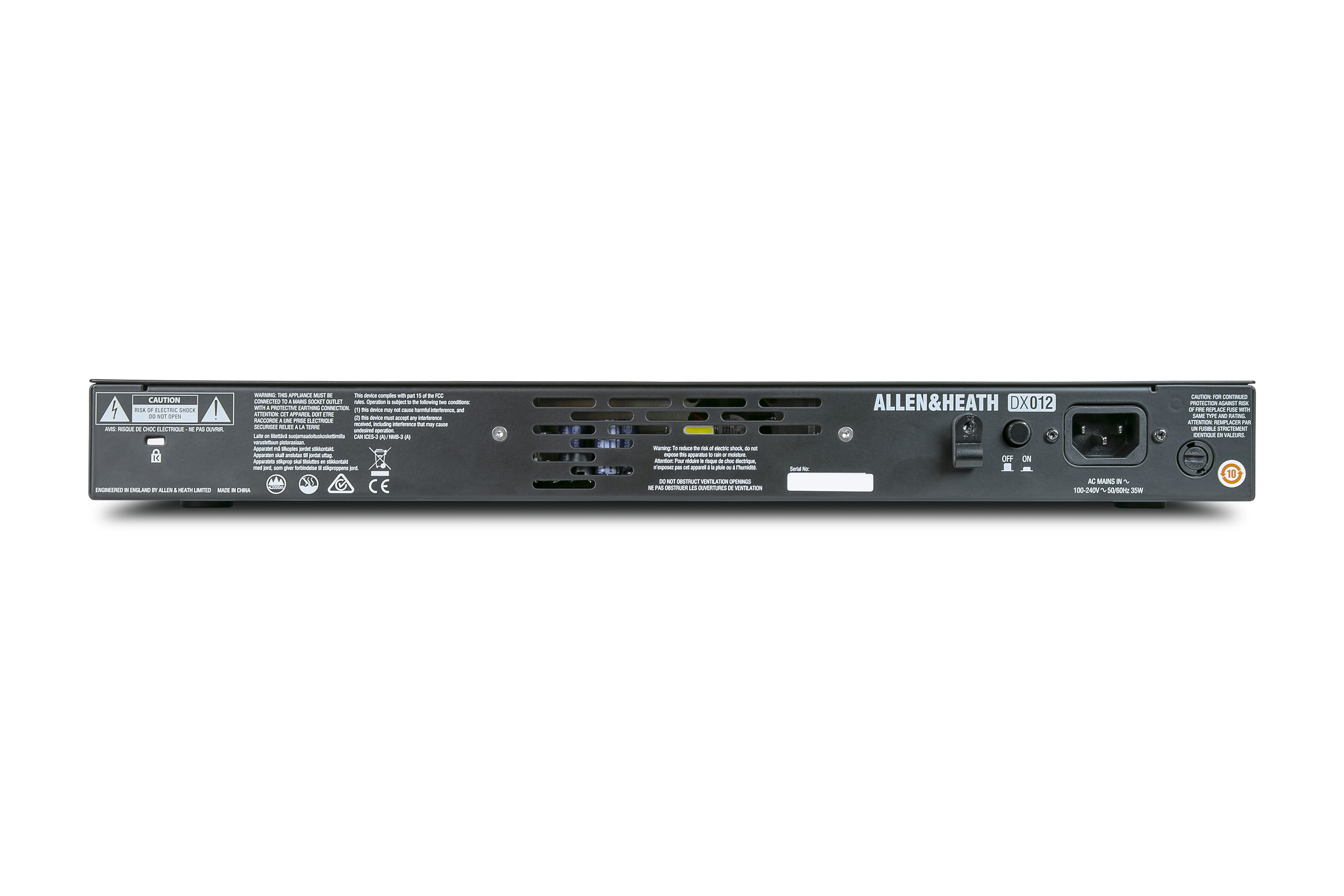 Рек розширення системи dLive / AHM / Avantis / SQ (інтерфейс DX), 1U, 12 XLR виходів (12 аналогових / 8 аналогових та 4 AES / 4 аналогових та 8 AES), 44.1 / 48 / 88.2 / 96kHz, 2 х EtherCON порти DX. DX012 підключається за допомогою одного кабелю Cat5e до dLive Surface, dLive MixRack, матричного процесора AHM-64, Avantis, SQ або розширювача DX через порт DX A. Порт EtherCon DX B передбачений для резервного підключення до сумісного обладнання або для послідовного підключення додаткового розширювача DX.