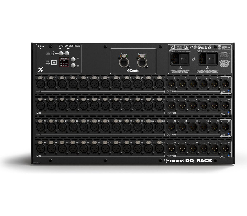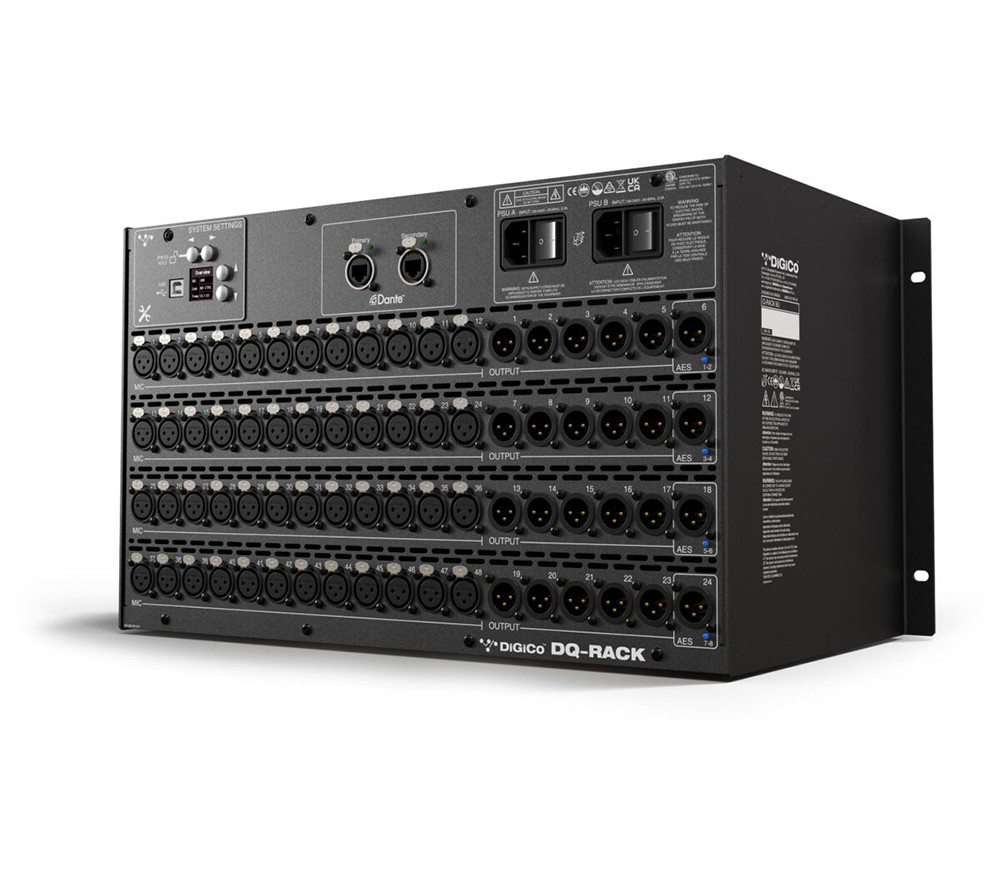 DQ-RACK: -6U висоти, -підключення по Dante -48 мікрофонних входів -До 24 лін виходів (або 20 лін виходу +4 стерео AES / EBU виходів) -Два блоки живлення DQ-Rack (або Quantum Dante Rack) - це нове покоління стейджбоксів DiGiCo. Це якість звучання SD-Rack в компактному і більш доступному за ціною форматі. Підтримка протоколу Dante дозволяє інтегрувати системи DiGiCo з цим стейджбоксом в мережеву інфраструктуру комплексних проектів. Компактний стейджбокс висотою 6U оснащений 48 мікрофонними входами і дозволяє організувати до 24 лінійних виходів. Останні 4 виходи можуть перемикатися між лінійними і цифровими (стерео AES / EBU). Таким чином, ви можете додати до 8 AES / EBU вихідних каналів. Підтримка Dante означає, що існуюча мережева інфраструктура об'єкту може бути використана для інсталяції системи DiGiCo. Підключення консолі до стейджбоксу здійснюється за допомогою карти DMI-DANTE64 @ 96. Це означає, що всі фізичні входи і виходи DQ-Rack будуть доступні як на 48 кГц, так і на 96 кГц. Для підвищення надій