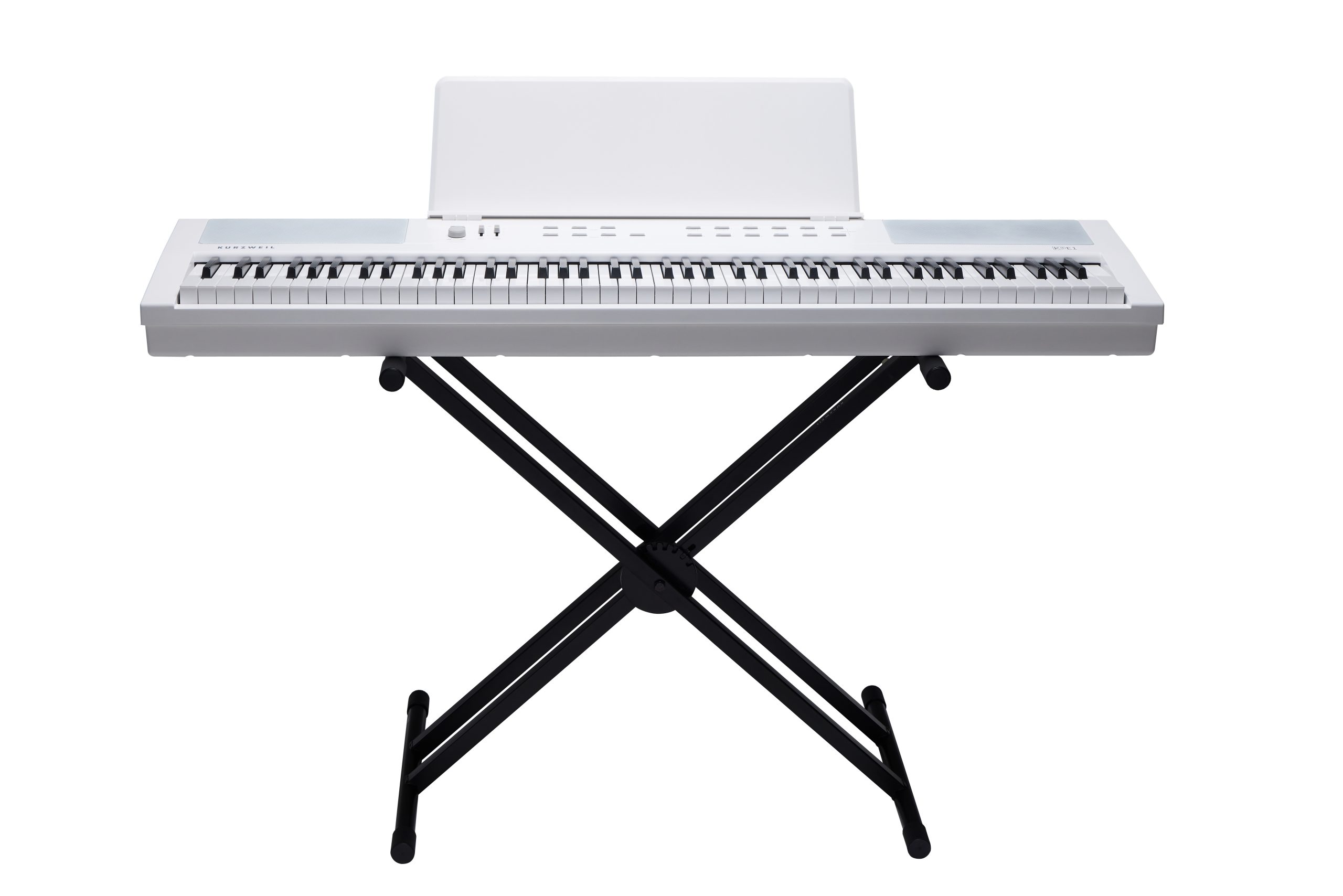 Kurzweil KA-S1 WH 21 168 грн. (є в наявності) Портативне цифрове піаніно KA-S1. 88 клавіш з напівзваженною молоточковою механікою та 6 рівнями чутливості клавіш (S1). звукова бібліотека KORE 1.0 (128MB), поліфонія 128 голосів, 16 програм (звуків), функціональність розділення та нашарування тембрів, транспонування, ефекти: Reverb, Chorus, EQ, рекордер на 1 трек, 1 пісню, акустична система 30 Вт (2 x 15Вт), аналогові входи: (1) 1/8″ стерео, аналогові виходи: (2) RCA лівий/правий, (1) вихід на 1/4″,MIDI по USB, (1) вхід для педалі сустейн (одинарна педаль в комплекті), комплектація: DC блок живлення, педаль сустейн, пюпітр, USB кабель. Колір: білий, розміри: 8 х 28 х 127 см, вага: 9 Кг.
