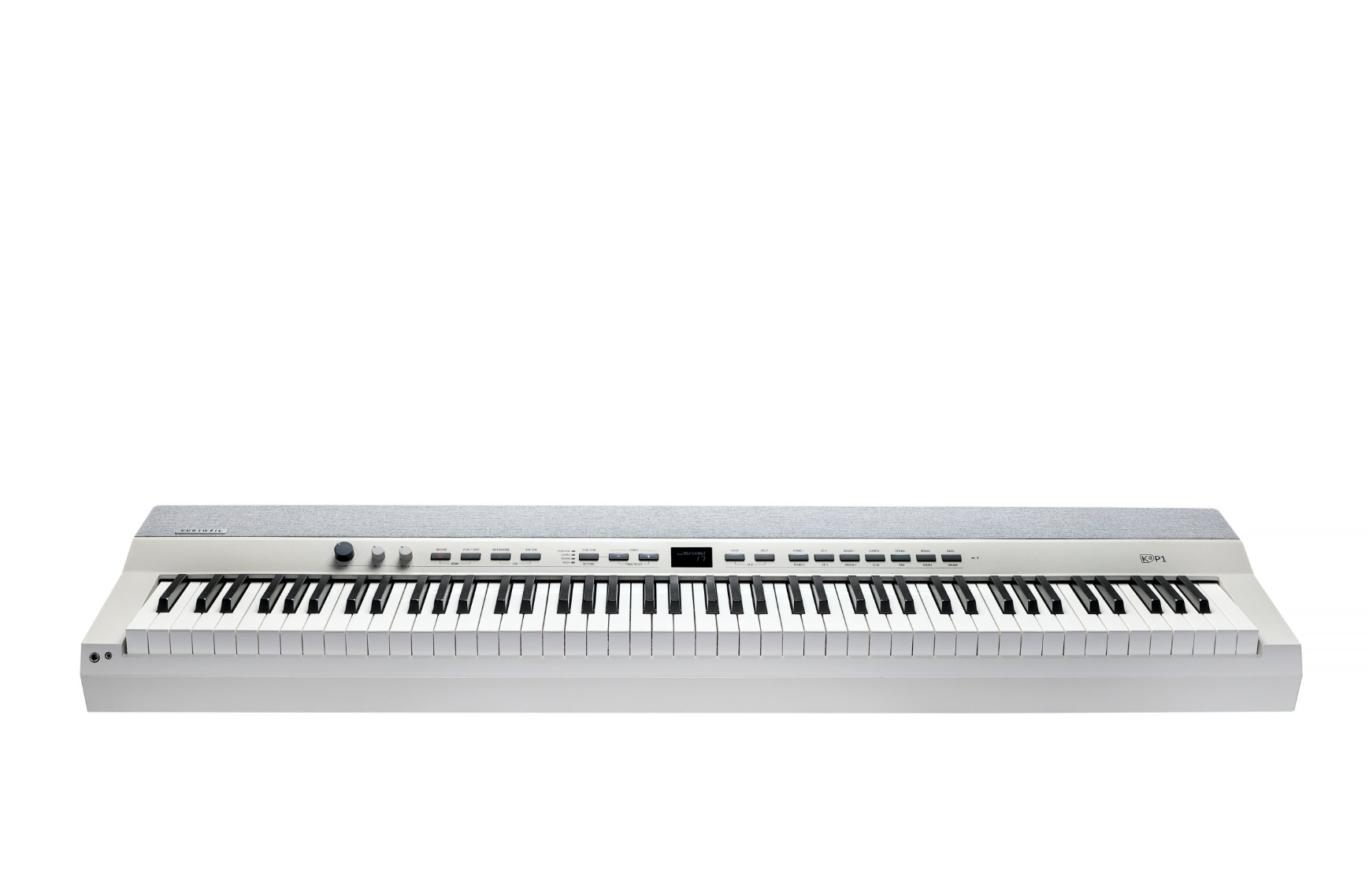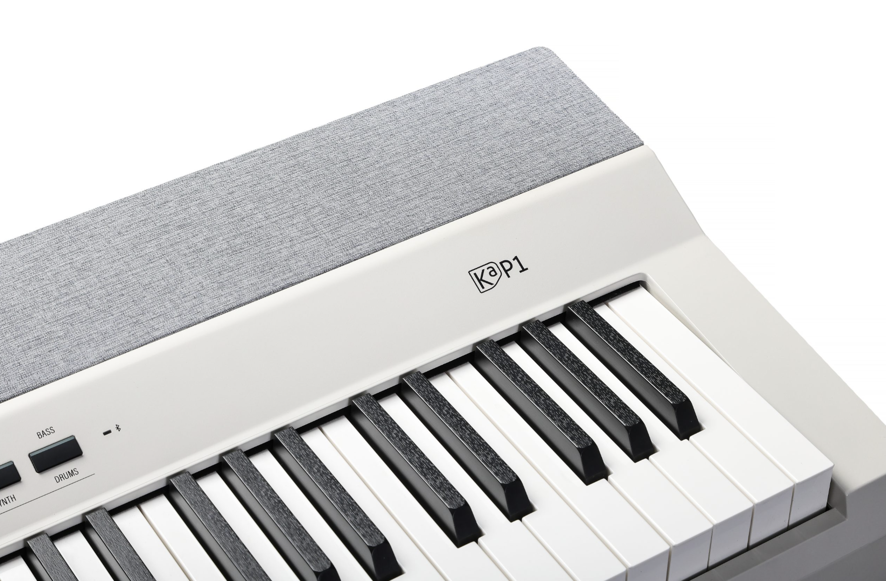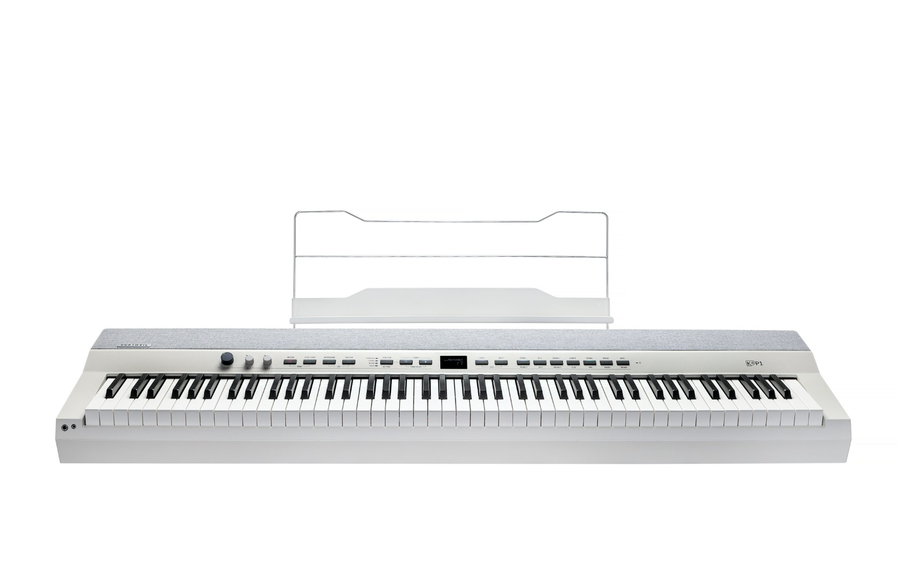 Портативне цифрове піаніно KA-P1. 88 клавіш з повнозваженою молоточковою механікою та 4 рівнями чутливості клавіш (H1 Ivory). LCD дисплей, звукова бібліотека KORE 2.0 (2GB), поліфонія 256 голосів, 28 програм (звуків), функціональність розділення та нашарування тембрів, транспонування, ефекти: Reverb, Chorus, EQ, 10 ритмічних патернів, рекордер на 1 трек, 1 пісню, акустична система 30 Вт (2 x 15Вт), аналогові входи: (1) 1/8″ стерео, аналогові виходи: (2) 1/4″ лівий/правий, вихід на навушники: (1) 1/4″, (1) 1/8″. MIDI по USB, Bluetooth: BT 5.2 Audio/MIDI, (1) вхід для педалі сустейн (одинарна педаль в комплекті), комплектація: DC блок живлення, педаль сустейн, пюпітр, USB кабель. Колір: білий, розміри: 11.7 х 33.5 х 131.6 см, вага: 19.7 Кг.
