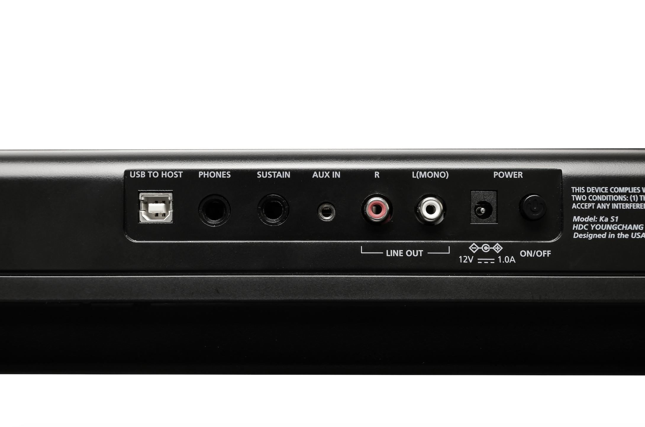 Портативне цифрове піаніно KA-S1. 88 клавіш з напівзваженною молоточковою механікою та 6 рівнями чутливості клавіш (S1). звукова бібліотека KORE 1.0 (128MB), поліфонія 128 голосів, 16 програм (звуків), функціональність розділення та нашарування тембрів, транспонування, ефекти: Reverb, Chorus, EQ, рекордер на 1 трек, 1 пісню, акустична система 30 Вт (2 x 15Вт), аналогові входи: (1) 1/8″ стерео, аналогові виходи: (2) RCA лівий/правий, (1) вихід на 1/4″,MIDI по USB, (1) вхід для педалі сустейн (одинарна педаль в комплекті), комплектація: DC блок живлення, педаль сустейн, пюпітр, USB кабель. Колір: чорний, розміри: 8 х 28 х 127 см, вага: 9 Кг.