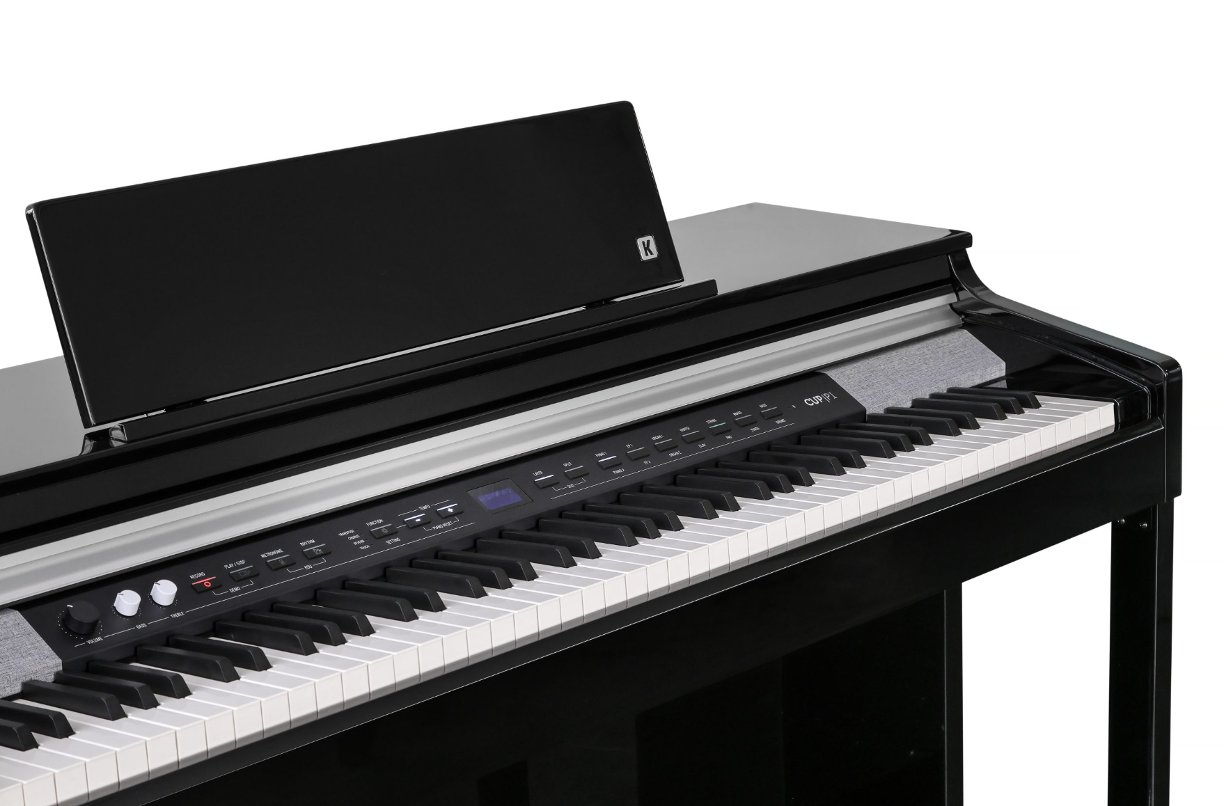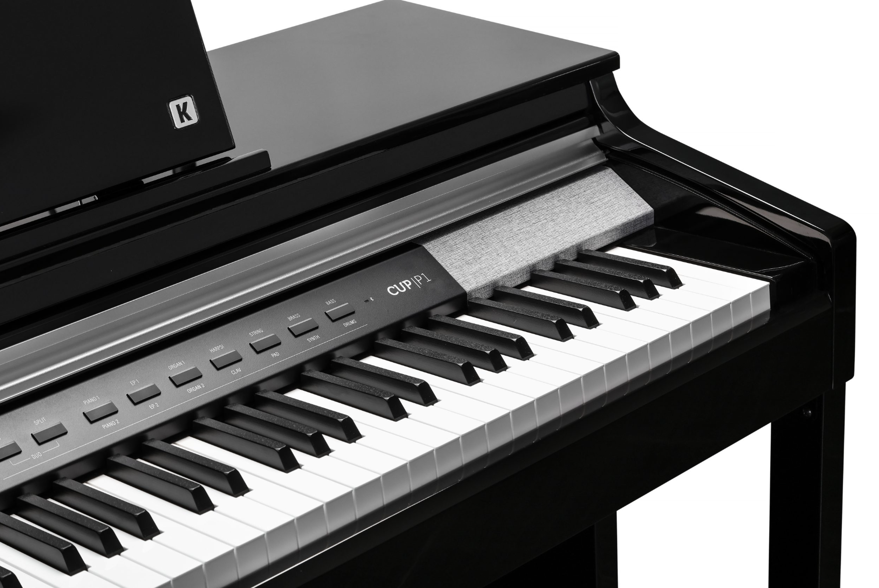 Цифрове піаніно CUP P1. 88 клавіш з повнозваженою молоточковою механікою та 4 рівнями чутливості клавіш (H1 Ivory). LCD дисплей, звукова бібліотека KORE 2.0 (2GB), поліфонія 256 голосів, 28 програм (звуків), функціональність розділення та нашарування тембрів, транспонування, ефекти: Reverb, Chorus, EQ, 10 ритмічних патернів, рекордер на 1 трек, 1 пісню, акустична система 30 Вт (2 x 15Вт), аналогові входи: (1) 1/8″ стерео, аналогові виходи: (2) 1/4″ лівий/правий, вихід на навушники: (2) 1/4″. MIDI по USB, Bluetooth: BT 5.2 Audio/MIDI, 3 стандартні рояльні педалі, комплектація: DC блок живлення, тримач для навушників, банкетка. Колір: чорний полірований, розміри: 85.6 х 138.3 х 50.8 см, вага: 56.4 Кг.