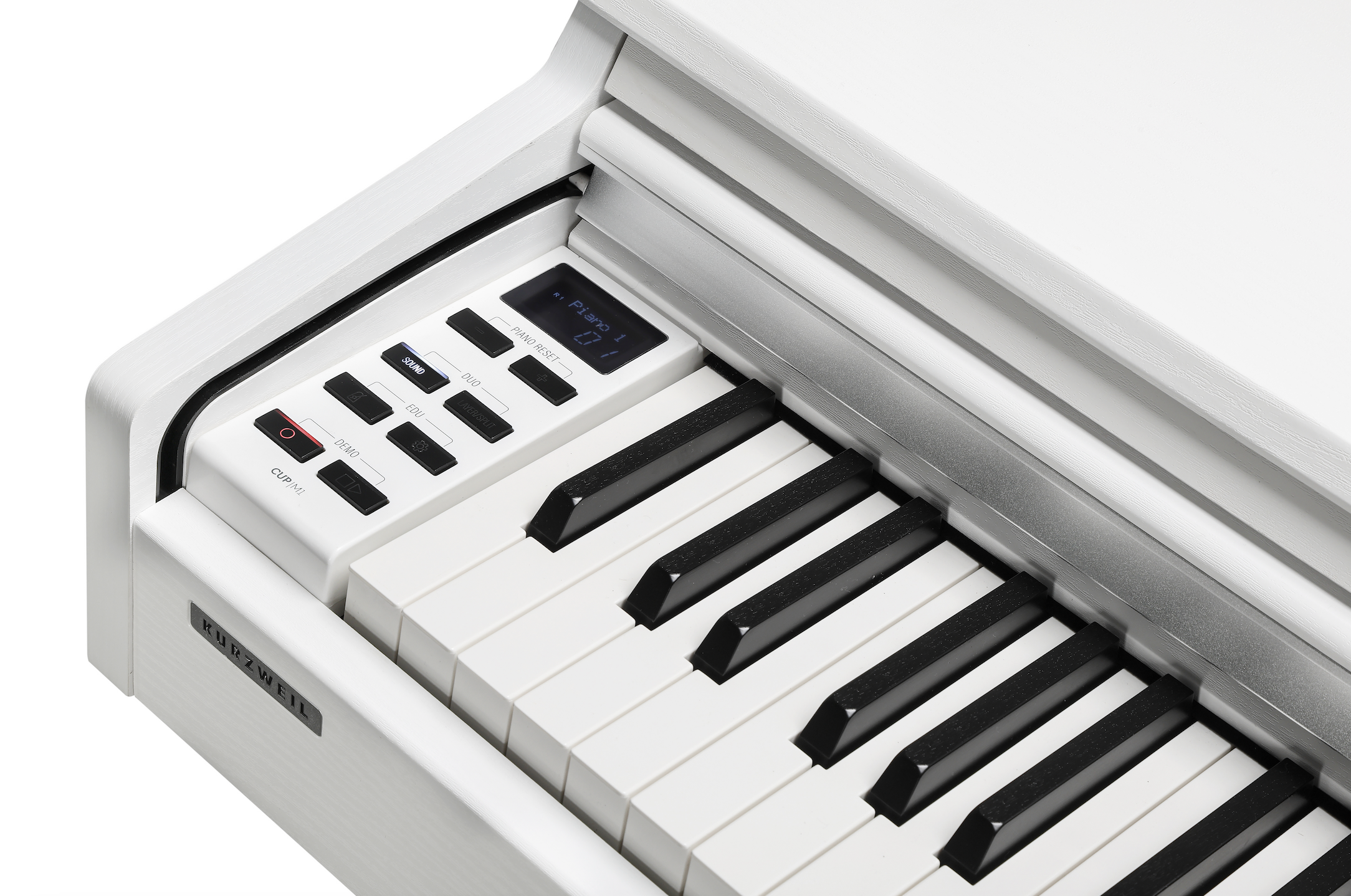 Kurzweil CUP P1 WH 63 504 грн. (є в наявності) Цифрове піаніно CUP P1. 88 клавіш з повнозваженою молоточковою механікою та 4 рівнями чутливості клавіш (H1 Ivory). LCD дисплей, звукова бібліотека KORE 2.0 (2GB), поліфонія 256 голосів, 28 програм (звуків), функціональність розділення та нашарування тембрів, транспонування, ефекти: Reverb, Chorus, EQ, 10 ритмічних патернів, рекордер на 1 трек, 1 пісню, акустична система 30 Вт (2 x 15Вт), аналогові входи: (1) 1/8″ стерео, аналогові виходи: (2) 1/4″ лівий/правий, вихід на навушники: (2) 1/4″. MIDI по USB, Bluetooth: BT 5.2 Audio/MIDI, 3 стандартні рояльні педалі, комплектація: DC блок живлення, тримач для навушників, банкетка. Колір: палісандр, розміри: 85.6 х 138.3 х 50.8 см, вага: 56.4 Кг.