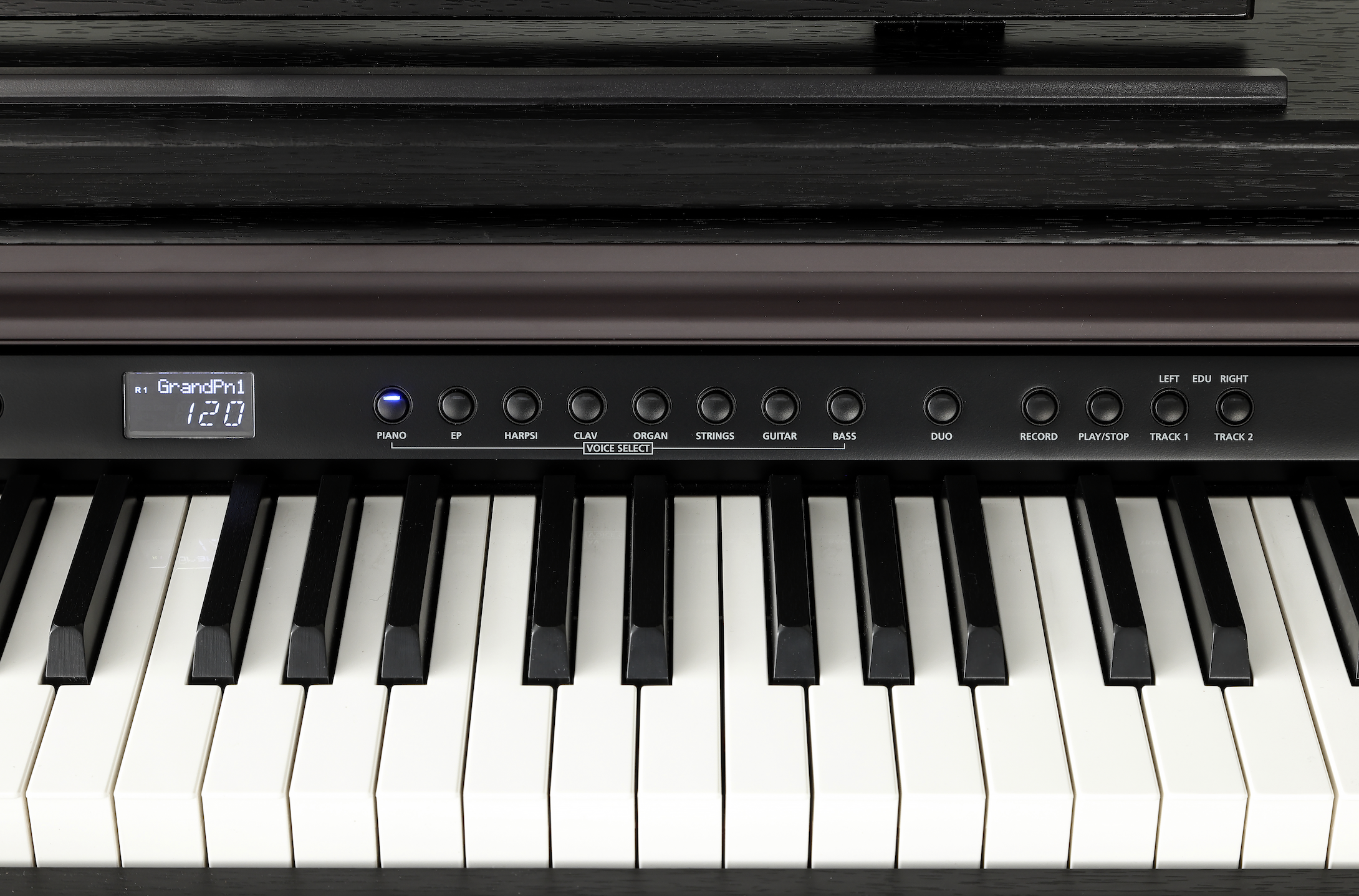 Цифрове піаніно. 88 клавіш з повнозваженою молоточковою механікою та чутливістю до натискання на клавіші (88RGTA), 6 обираних рівнів чутливості, Поліфонія: 32 голоси, програми: 16 основних (+116 для GM), функції нашарування тембрів, розділення клавіатури, режим Dual, 50 демо композицій + 221 навчальна композиція, рекордер: 5 композицій, General MIDI, Транспонування, Мікроподстройка, метроном, Режим навчання, акустична система: 30 W (15W + 15W), стерео лівий/правий RCA лінійні виходи, стерео лівий/правий RCA лінійні входи, 2 стерео виходи для навушників 1/4", USB передає MIDI сигнал, 3 вбудованих педалі сустейн, состенуто, софт (з ефектом напів-натиснення), колір: палісандр, банкетка під колір інструменту в комплекті, розміри: 1362 мм (ширина) x 440 мм (глибина) x 855 мм (висота), вага: 43.5 кг, живлення: зовнішній блок живлення DC 12V, 2.0A. |
