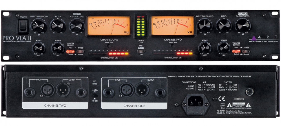 Двоканальний опто-ламповий компресор, вхідні роз'єми: 2 x XLR, 2 x 1/4" TRS; вихідні роз'єми: 2 x XLR, 2 x 1/4" TRS; перемикач рівня: +4 dBu / -10 dBu; діапазон порогу спрацьовування: -30 dB до +20 dB; коефіцієнт стиснення: 2:1 до 20:1; час атаки: 0,25 мс до 50 мс; час відпуску: 0,15 с до 3 с; максимальний вхідний рівень: +20 dBu; максимальний вихідний рівень: +20 dBu при 10 кОм навантаженні; частотна характеристика: 10 Гц до 100 кГц (±0,5 дБ); динамічний діапазон: більше 100 дБ (20 Гц до 20 кГц); шум: EIN -99 дBu (A-вагомість) при +4 dBu; живлення: 105~125 VAC, 60 Гц; розміри: 483 мм (ширина) x 234 мм (глибина) x 89 мм (висота); вага: 4,8 кг.​