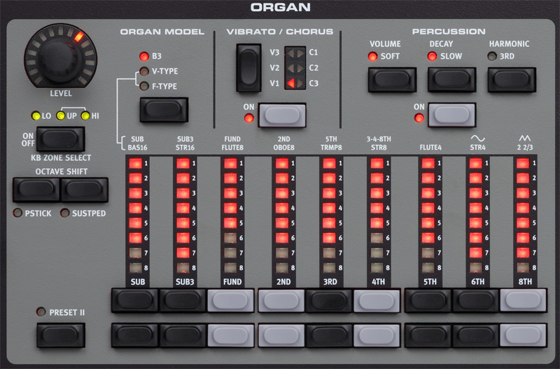 ![]() В органной секции имеется три различных органа. Во-первых, это легендарный орган Hammond B3, где применено множество новейших решений для максимального приближения к живому звучанию: