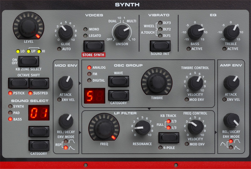 Nord Stage имеет уникальный регулятор унисона, а также фильтр низких частот (12/24 дБ/окт) с резонансом, генератор амплитудной и модуляционной огибающей, LFO и двухполосный эквалайзер. Предлагается три различных банка звуков: Synth, Pad и Bass, предназначенных для создания и хранения собственных пэтчей, до 100 в каждом банке.