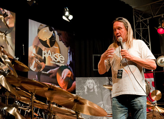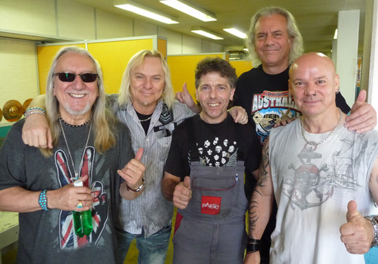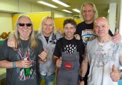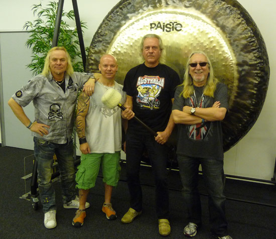 Uriah Heep посетили фабрику Paiste. Рок-легенды Uriah Heep отмечают свое 40-летие обширным туром “Celebration” в поддержку своего последнего альбома, на котором они переиграли некоторые свои старые классические хиты. Тур пролегает через страны Европы, Южной Африки и США. Будучи в ходе тура в Швейцарии, музыкантам представилась возможность посетить фабрику Paiste. Не только барабанщик Рассел Гилбрук, а также гитарист и основатель Мик Бокс, вокалист Берни Шоу и клавишник Филл Лэнзон были более чем впечатлены не только 80-ти дюймовым симфоническим гонгом в шоу-руме, но также аккуратностью и точностью мастеров. Позже ночью Uriah Heep доказали в очередной раз насколько потрясающей живой командой они являются. Они играли программу, составленную из таких своих хитов как, “Free Me”, “Easy Livin’”, “July Morning” и “Lady In Black” наряду с несколькими вещами из своего потрясающего последнего студийного альбома “Wake the Sleeper”. Они практически накрыли народ волной, что доказало ещё раз почему Uriah Heep всё ещё один из лучших живых британских актов. Компания Paiste благодарит группу Uriah Heep за визит! Знакомство с продуктом: 2002 Big Ride 24“ С 1983 года тарелки Paiste были неотъемлимой частью уникального звука Алекса Ван Халена. Его набор тарелок всегда состоял преимущественно из тарелок серии 2002, поэтому не удивительно, что новая тарелка “Reverend Al’s Big Ride”, созданная в сотрудничестве с Алексом, является частью серии 2002. По звуку этот 24-дюймовый райд схож с аналогичной тарелкой серии Giant Beat, которая являлась фаворитом среди райдов для Алекса с момента возобновления производства серии Giant Beat в 2005-м году. Команда по развитию звука компании Paiste взяла за основу спецификации тарелки Giant Beat 24”, перенимая форму Giant Beat, вес, форму бэлла и тип ковки. Эта замечательная тарелка обработана с использованием безошибочной, характерной для серии 2002 технологии. Она отличается от Giant Beat прежде всего замечательным ярким пингом и, будучи относительно лёгкой по весу, Big Ride характерен насыщенным, полным звуком, покрывающим широкий динамический диапазон. Этот райд, по сути, является также потрясающей крэшевой тарелкой. Помимо 22” Signature Blue Bell Ride “The Rhythmatist”, 22” Signature Bell Ride “The Powerslave” и 24” RUDE Mega Power Ride “The Eclipse”, “Reverend Al’s Big Ride” – очередное достижение в линейке райдовых тарелок, инспирированных артистами.