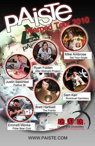 Артисты Paiste стали участниками тура Drums and Disabilities Warped Tour 2010 года Артисты Paiste присоединились к Pat’у Gesualdo, организатором тура Drums and Disabilities в этом году. DAD (Drums and Disabilities) – это некоммерческая организация (дословно Барабаны и Инвалидность), помогающая детям и взрослым, больным аутизмом, дислексией и другими болезнями, развивать чувства координации, памяти, самооценку, физические и познавательные функции. В течении всего тура артисты Paiste, участвующие в нем, будут проводить автограф сессии на D.A.D. стенде на каждом шоу в течении тура. Не часто столько много артистов собираются на одну автограф сессию. Артисты PAISTE на Warped Tour: Mike Ambrose из SET YOUR GOALS Ryan Folden из AFTER MIDNIGHT PROJECT Justin Bawinkel из FLATFOOT 56 Emmett Menke из POLAR BEAR CLUB Brett Hartwell из The FRANTIC Sam Keir из RIVERBOAT GAMBLERS