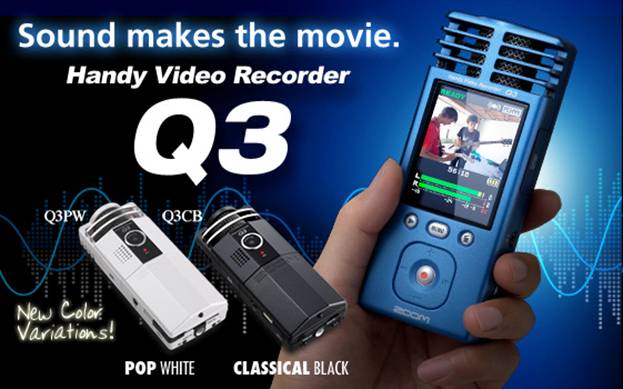 Компания Zoom вывела на рынок новый рекордер, позволяющий записывать аудио и видео длительностью до 1 ч. Существует возможность расширения памяти, что позволяет увеличивать время съемки до 16 часов. Предусмотрена возможность обработки информации прямо в Q3, либо ее копирования в Ваш компьютер через USB порт. Видео записывается в формате MPEG-4, звук MP3. Прибор оснащен большим LCD экраном, позволяющим просматривать отснятый материал и динамиком для прослушивания аудио дорожек.
