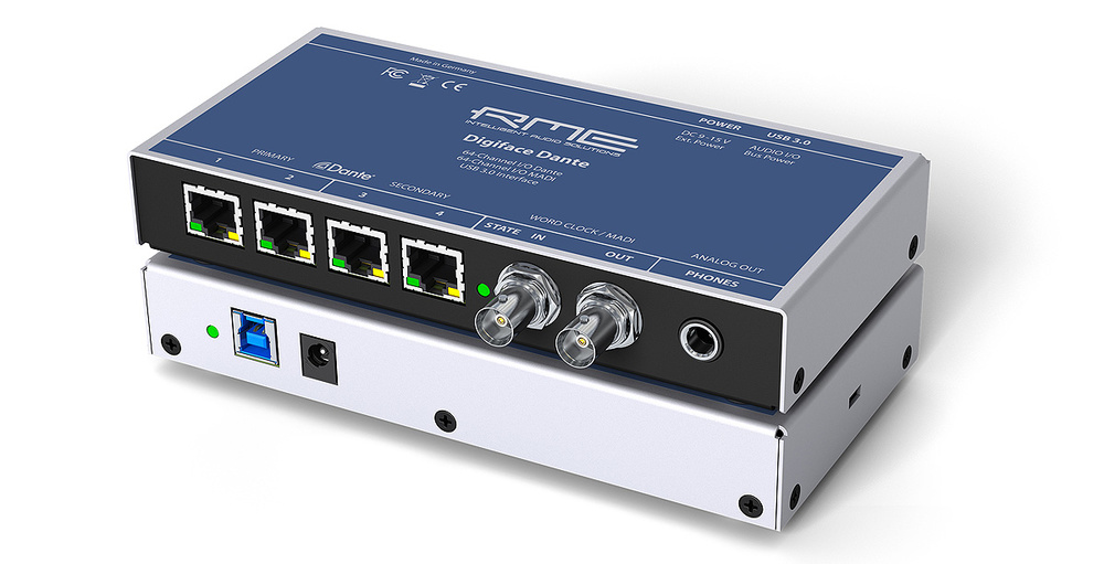 На передній панелі елегантного сіро-синього корпусу розташовано чотири гнізда RJ45 для первинного та вторинного Dante Gigabit (сумісність зі швидкістю 100 Мбіт/с) Ethernet підключень (також із loop-throughs), а також вхід та вихід з роз’ємами BNC для коаксіального MADI або стандартного word-clock-підключень. Внутрішній вимикач забезпечує вхідний імпеданс 75Ω, якщо це необхідно. Є також і стандартний ¼-дюймовий роз’єм для навушників із живленням від внутрішнього DSP для забезпечення моніторингу джерел без затримки сигналу, I/O-маршрутизації та мікшування. Все це контролюється через уже знайомий додаток RME TotalMix FX (який може також бути доступним через мережеве підключення). «Цей суперкомпактний інтерфейс поєднує в собі 128 каналів аудіо з частотою дискретизації 48 кГц — в обох напрямках». На задній панелі є лише USB 3 порт типу B і коаксіальний роз’єм живлення байонетного типу з можливістю блокування, який приймає постійний струм 9-15 вольт. Мережевий блок класу ІІ, що входить до комплекту (з подвійною ізоляцією або без заземлення), може забезпечувати до 2 А, але інтерфейс зазвичай може отримувати живлення від шини через підключення USB 3. Я кажу «зазвичай», оскільки є винятки — цим обумовлене живлення від мережі. У технічних характеристиках від RME сказано, що пристрій споживає близько 3 Вт, а це дорівнює 600 мА при роботі на живленні від шини 5В, як шв специфиікації USB 3. Однак, якщо одночасно застосувати всі чотири мережеві підключення та моніторинг в навушниках, поточні вимоги можуть перевищувати 900 мА, що є теоретичним лімітом для стандартного USB-роз’єма. І можуть навіть перевищувати ліміт 1,5A для спеціального порту зарядки. Цікаво, що є можливість використовувати Digiface Dante в автономному режимі без комп’ютера (вимагається, щоб він отримував живлення від електромережі), тоді він слугує двонаправленим конвертером Dante/MADI-формату.