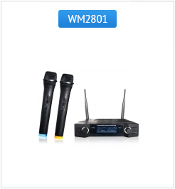 WM2801 укомплектована двома ручними динамічними радіомікрофонами з фіксованими несучими (729,4 МГц та 700.4 Мгц), передавачі живляться від двох батарей АА. База-приймач напіврекового формату має окремі регулятори гучності для кожного з каналів, окремі симетричні виходи XLR та загальний вихід MIX OUT на роз’ємі “джек” 6.3мм. В комплекті поставляється кабель “джек – джек” 6.3 мм довжиною 1 м та пластиковий кейс з пінним ущільнювачем.