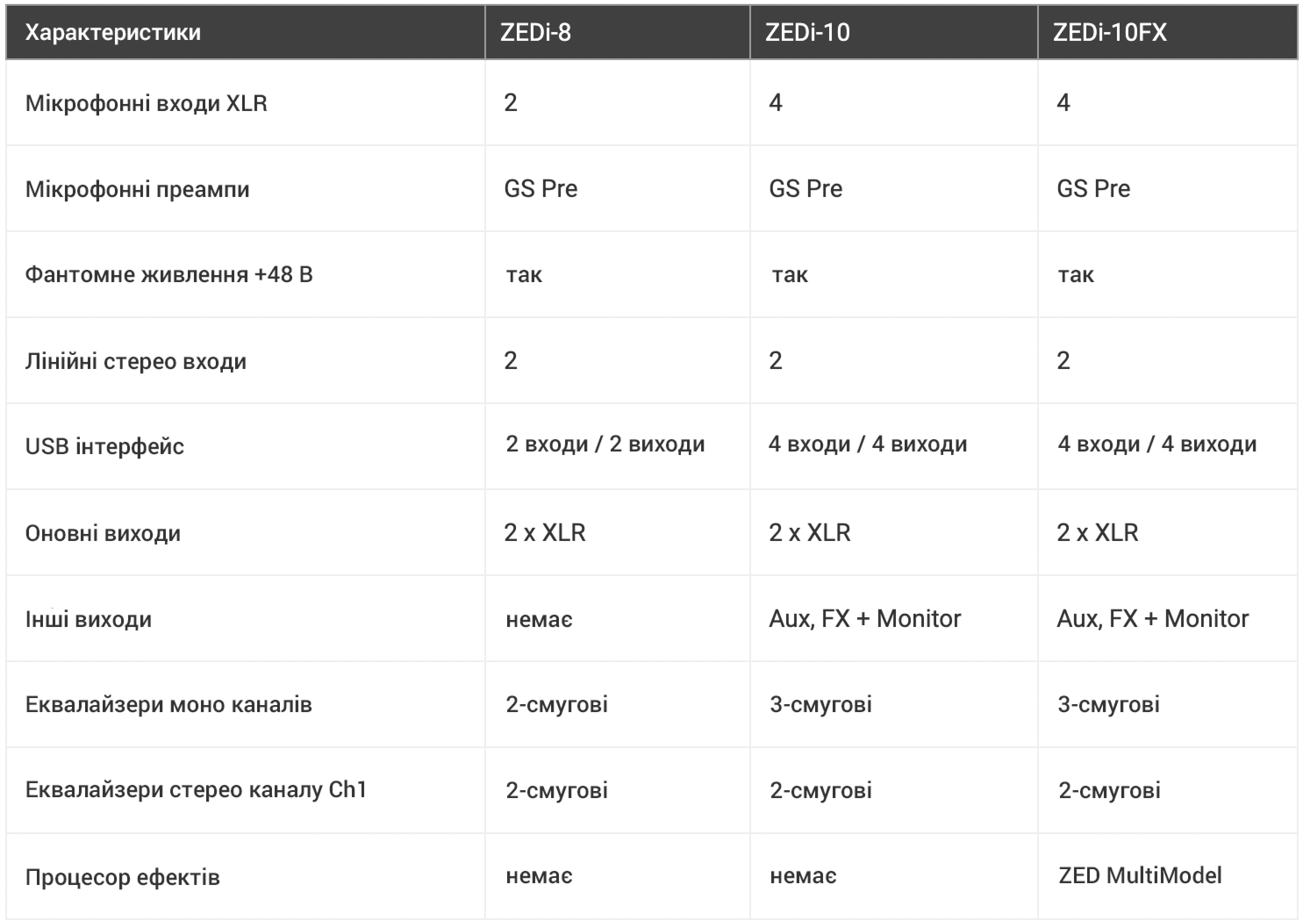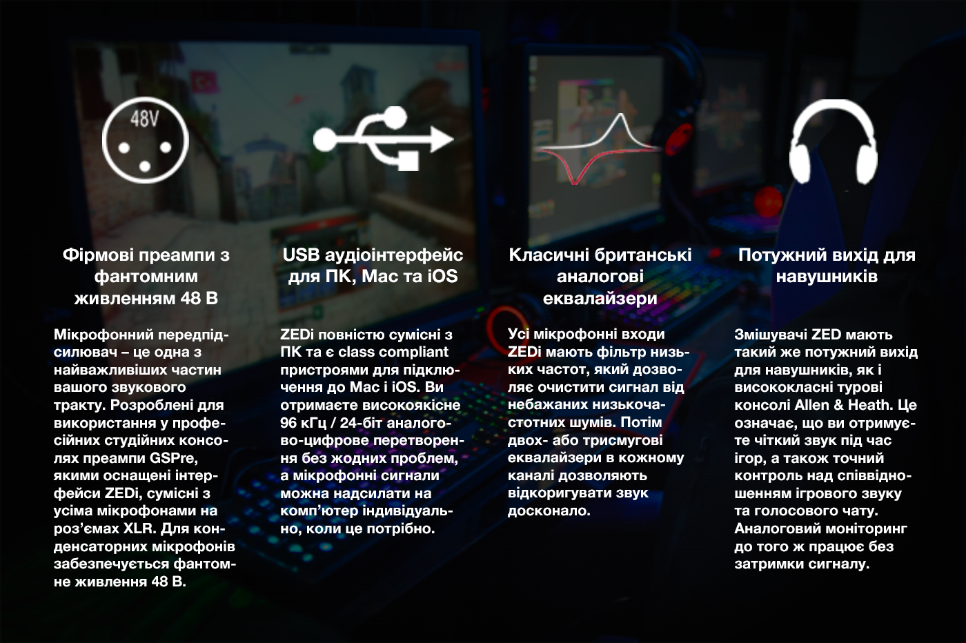 ![]() Кращий звук. Краще керування. Хочете вивести стріми своїх ігор на якісно новий рівень? Хочете виділятися завдяки якіснішому звуку? Незалежно від того, чи ви спілкуєтесь зі своїми товаришами по команді, ведете пряму трансляцію на Twitch, чи записуєте влоги для YouTube, ZEDi – це ідеальний аудіоінтерфейс для розвитку вашої творчості, з яким ваші стріми зазвучать по-новому! ![]() Пристрої серії ZEDi пропонують високу якість звуку, надійність та зручне керування класичного аналогового мікшера у поєднанні з універсальністю та функціональністю багатоканального USB аудіоінтерфейсу. Ви можете запитати, навіщо мені мікшер? Ну, якщо коротко, за допомогою мікшера ви можете покращити керування своїм звуком без потреби у додатковому обладнанні чи програмному забезпеченні для редагування звуку. Ідеальне рішення для досягнення найвищої якості звуку під час прямих трансляцій, а також для стрімінгового сетапу на двох комп’ютерах! Видатна якість звуку Завдяки мікрофонним передпідсилювачам студійного класу GSPre від Allen & Heath, ZEDi може похвалитися надзвичайно низьким рівнем шуму та величезним запасом підсилення, а звучання має аналогову теплоту та глибину, забезпечуючи високу чіткість звуку для трансляції. Використовуючи справжню мікшерну консоль, таку як ZEDi, ви можете бути впевнені, що цей інтерфейс не є вузьким місцем звукового тракту. З ним ви отримаєте найкращу якість звуку від недорогого мікрофона або можете використовувати професійний конденсаторний мікрофон, щоб передати кожен нюанс вашого голосу. Відкоригуйте звучання за допомогою плавного аналогового еквалайзера, прослуховуючи в моніторах з нульовою затримкою, і врешті отримаєте чіткий цифровий звук на своєму комп’ютері. ![]() Простота налаштування та використання Інтерфейси ZEDi є простими і швидкими у налаштуванні, і після кількох хвилин підготовки ви можете виходити у прямий ефір. Окремі елементи керування дозволяють швидко та легко регулювати рівні та маршрутизацію сигналів. Прослуховуйте саме те, що вам потрібно, і будьте певні, що світ також почує вас. Ви можете швидко мікшувати голоси, комп’ютерні та зовнішні аудіоджерела з високою точністю. ![]() Всі ваші налаштування та рівні сигналів постійно під контролем, тому будь-які несправності в тракті виявляються за лічені секунди. ![]() Порівняльна таблиця моделей серії ZEDi ![]() ![]() Джерело