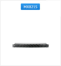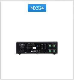 MX524, який має 4 мікрофонні / лінійні входи з фантомним живленням +48 В, 1 стереовхід RCA, двосмугові еквалайзери на кожному вході, 4 вихідні зони, вихід на навушники, моніторний вихід, функції пріоритету, оголошення, резервне живлення від 24 В.