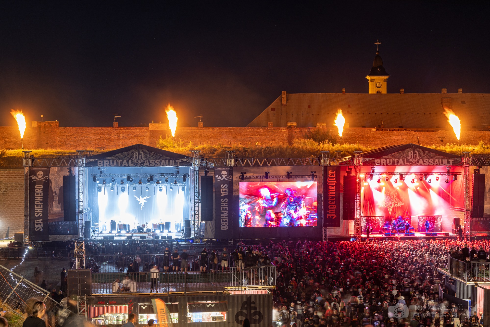 ![]() Brutal Assault 2022. Фото: Tomáš Vojtíšek Важка музика вимагає від систем концертного звукопідсилення найвищої якості. Насичені аранжування, багате гармоніками та динамічне звучання інструментів і вокалу, а також потужні мікси потребують найчистішого відтворення на PA, адже жорстких спотворень сигналу вистачає й у самій метал-музиці. Організатори великого європейського метал-фестивалю Brutal Assault, який після дворічної перерви через пандемію нещодавно повернувся у стіни фортеці Йозефов поблизу чеського містечка Яромерж, чудово розуміють важливість якісного звуку. Тому на всіх сценах Brutal Assault ’22 працювало найкраще звукове обладнання від L-Acoustics. ![]() Розгортання PA на двох головних сценах Brutal Assault ’22. Фото: Libor Vočadlo Дві головні сцени – Sea Shepherd та Jagermeister, розташовані поруч, працювали, як і зазвичай, у шаховому порядку по черзі – поки на одній сцені йде виступ, на іншій проводиться саундчек. Тут використовувались 4 підвіси (два на кожній сцені) по 8 елементів масивів K1, доповнені чотирма кабінетами K2 знизу, а також стеками KARA у фронтілах. ![]() Шоу несеться! Фото: Libor Vočadlo Озвучування ще однієї сцени Obscure Stage практично ні в чому не поступалось головним сценам. Портали налічували по 8 широкоформатних кабінетів K1 і були знизу доповнені трьома елементами KARA з кожного боку. Ще три стеки по два бокси KARA були розміщені спереду на сабвуферах і працювали у якості фронтфілів. Арка з 12-ти сабів SB28 з величезним запасом качала низи. На сцені працював десяток стареньких, але надійних моніторів 115FM, плюс саб SB18 у драмфілі, а також 4 ARCS + 2 SB28 у сайдфілах. Два фірмові реки LA-RAK та сім LA-RAK II забезпечували підсилення для всіх акустичних систем. ![]() PA на Obscure Stage: L-Acoustics K1 + KARA Київський гурт IGNEA у завершальний день фестивалю відкривав сцену Obscure, і йому одразу вдалося зібрати кількатисячний натовп шанувальників, над яким майоріли наші блакитно-жовті прапори. ![]() Шалена підтримка українського гурту на Brutal Assault. Фото: Libor Vočadlo «Головна задача турового звукоінженера – підготуватися заздалегідь, бо на фестивальному лайнчеці ти лише маєш час, щоб запатчитись, підлаштувати ґейни і деякі нюанси динаміки та еквалізації по місцю. Саме тому я завжди наперед дізнаюся про все обладнання і приходжу на FOH з готовою сценою на флешці, тільки так. Люблю, знаєте, за консоллю завжди почуватися, “як вдома”».
