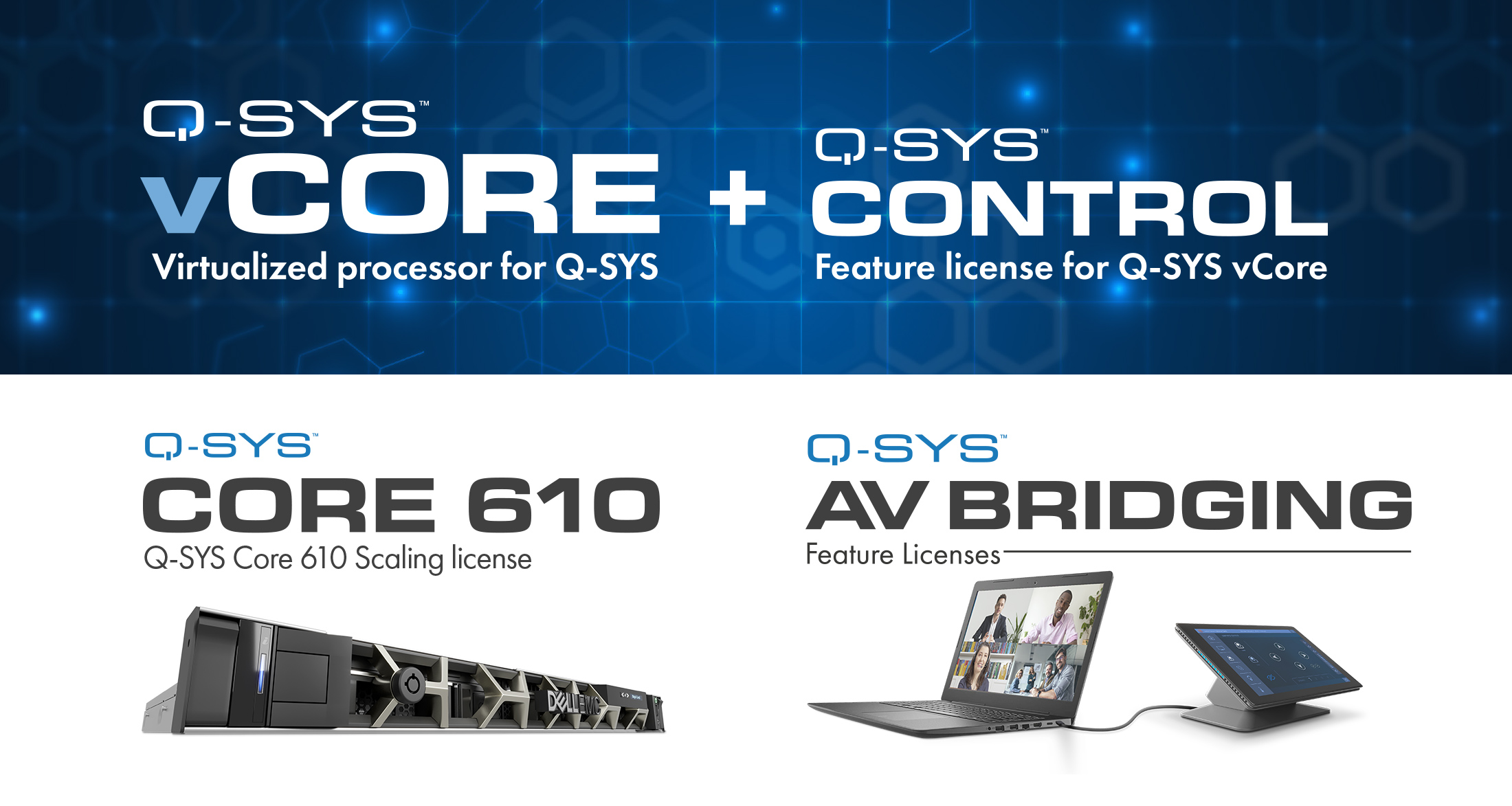 Віртуалізований процесор Q-SYS vCore представляє підмножину масштабованих функцій Q-SYS у повністю програмному форматі, реалізованому через гіпервізор на ПК чи сервері. У поєднанні з новою ліцензією на функцію Q-SYS Control vCore дозволяє інтеграторам і кінцевим користувачам залучати власні обчислювальні пристрої в системи і за допомогою Q-SYS Control розширювати можливості керування, автоматизації, UX-дизайну, віддаленого моніторингу та функції служби підтримки. Це ідеально підходить для менш складних систем, які не вимагають спеціального аудіо- чи відеофункціоналу Q-SYS або інших функцій, які вже реалізовані за допомогою окремого апаратного забезпечення, DSP аудіопроцесорів, а також для тих систем, в яких потрібно замінити застарілі засоби керування.