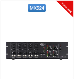 MX524 на 4 мікрофонні / лінійні входи з фантомним живленням +48 В, 1 стереовхід RCA та 4 вихідні зони.