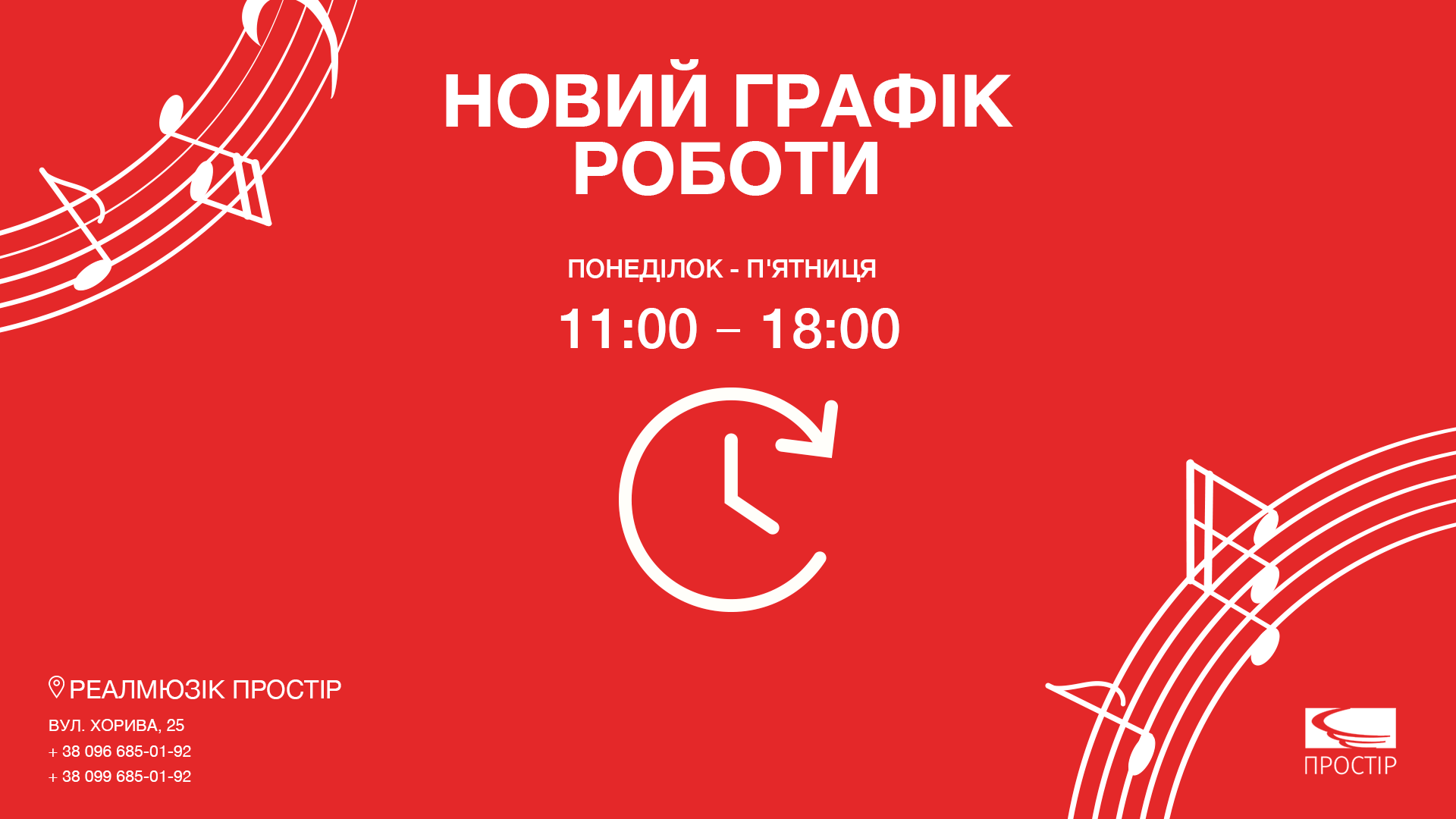 ![]() До уваги реальних відвідувачів нашого РеалМюзік Простору на Подолі, які заходять до нас за покупками або й просто дружньо потеревенити про музику, інструменти, обладнання тощо! Вже з понеділка, тобто з 20 березня ми працюємо за новим графіком: * від понеділка до п'ятниці — з 11:00 до 18:00. Тепер у нас з вами трошки більше часу на спілкування та покупки! Телефонуйте нам: +38 096 685 01 92 +38 099 685 01 92 І обов'язково заходьте — будемо раді вас бачити у Києві на Хорива, 25! |