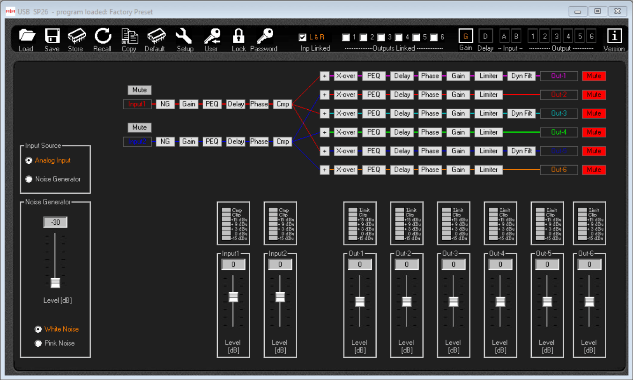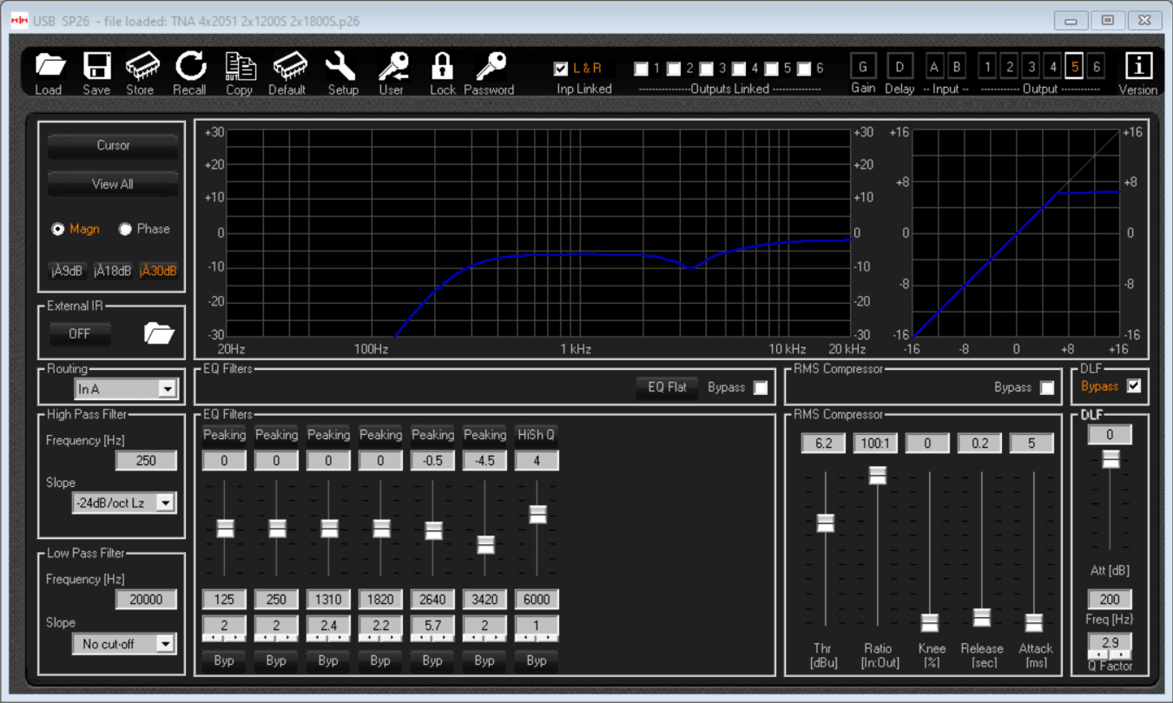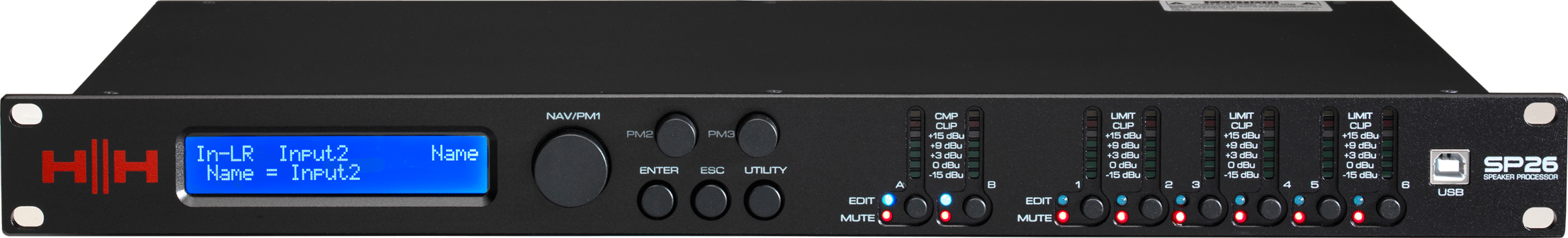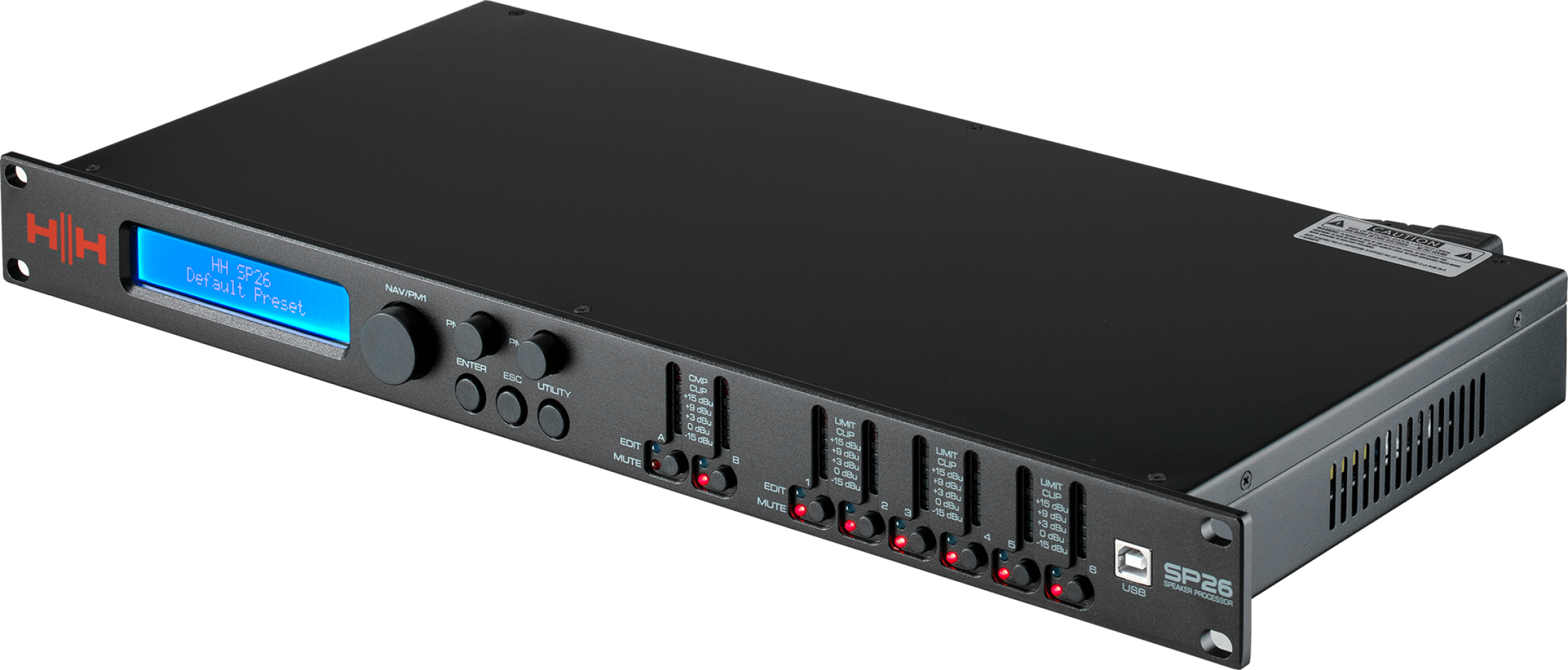 ![]() ![]() ![]() Пристрій має 2 аналогові входи та 6 аналогових виходів, кожен з яких керується потужним DSP процесором. Кожен вхідний канал має розширену параметричну еквалізацію, регулювання підсилення, динамічний НЧ-бустер, ґейт шумозаглушення, RMS-компресор, внутрішній генератор білого / рожевого шуму та налаштування затримки. Кожен вихідний канал має 7-смуговий параметричний еквалайзер та фільтри кросоверів. ![]() Простота налаштування параметрів забезпечується інтуїтивно зрозумілими елементами керування на передній панелі та інтерактивним РК-дисплеєм, а також спеціально розробленим програмним інтерфейсом для віддаленого моніторингу та налаштування пристрою через USB або RS485 на комп'ютері. ![]() ![]() Спікер-процесор SP26 є ідеальним доповненням для будь-якої звукопідсилювальної системи HH, він підходить для цілого ряду задач, таких як концертне звукопідсилення, проведення різного роду заходів, публічних виступів, театральних вистав та турової діяльності. SP26 поставляється з фірмовими нативними пресетами для лінійних масивів HH TNA, що дозволяють легко почати роботу з ними прямо “з коробки”. Технічні характеристики