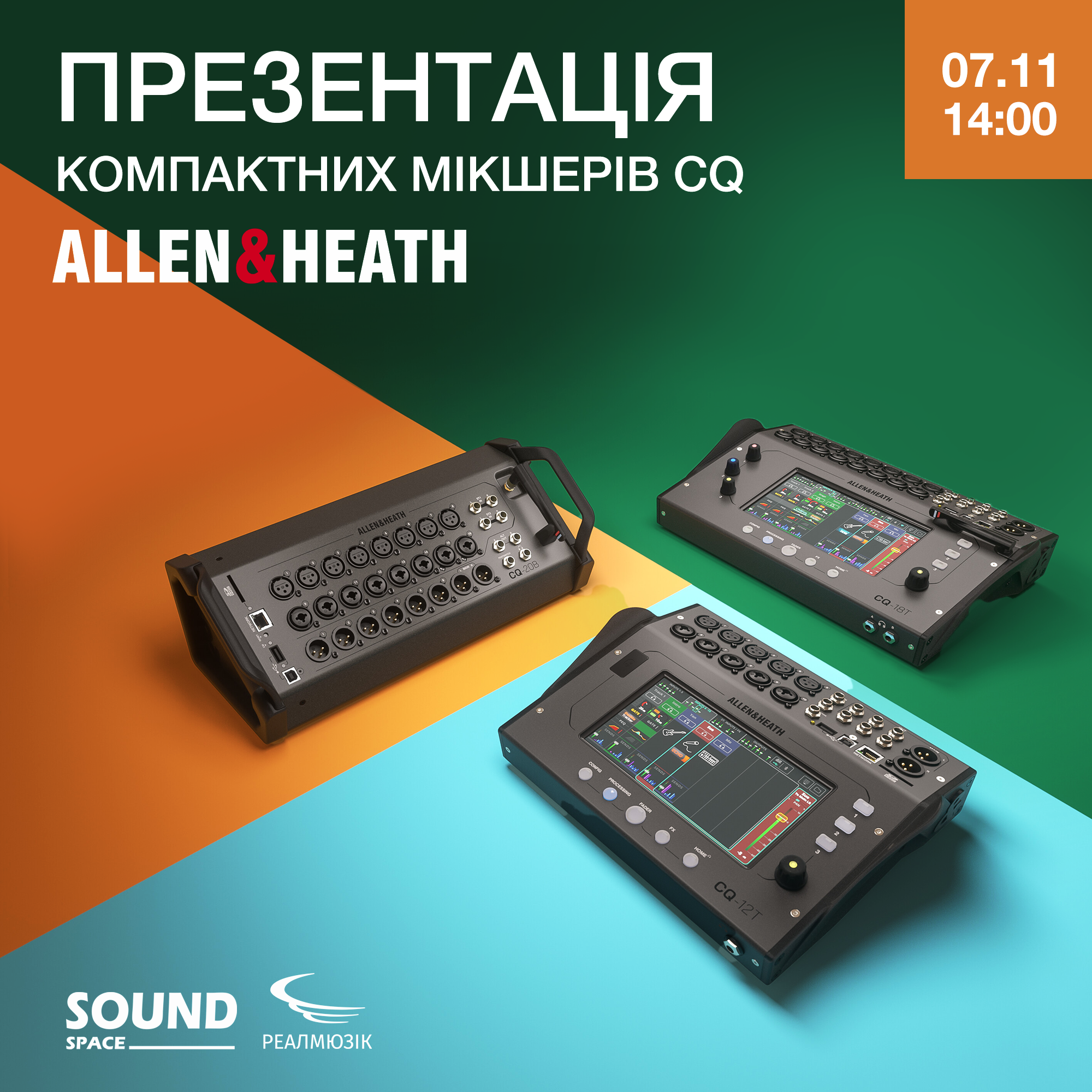 ![]() Компанія РеалМюзік, офіційний дистриб'ютор Allen & Heath в Україні, та перший простір професійного звуку SoundSpace UA запрошують на презентацію нових суперкомпактних, портативних, простих і водночас багатофункціональних цифрових мікшерів Allen & Heath серії CQ! 7 листопада о 14:00 чекатимемо вас в шоу-румі SoundSpace за адресою: Крюківщина, вул. Київська 37. Приміщення також є укриттям, тому нашій презентації не зможуть завадити навіть кляті сусіди. Але кількість місць в шоу-румі обмежена, тому потрапити на нашу презентацію можна тільки за умови попередньої реєстрації. Ви отримаєте вичерпну інформацію та демонстрацію можливостей кожної з трьох моделей нової лінійки: CQ12-T, CQ18-T та СQ-20B. Теоретична частина також транслюватиметься онлайн на нашому YouTube-каналі, тицяйте на дзвіночок, аби не пропустити! Вестиме презентацію один з наших найкращих технічних спеціалістів Антон Швед, а допомогатиме йому команда SoundSpace. І, як завжди, компанія РеалМюзік приготувала для відвідувачів та найактивніших учасників приємні сюрпризи та подарунки!