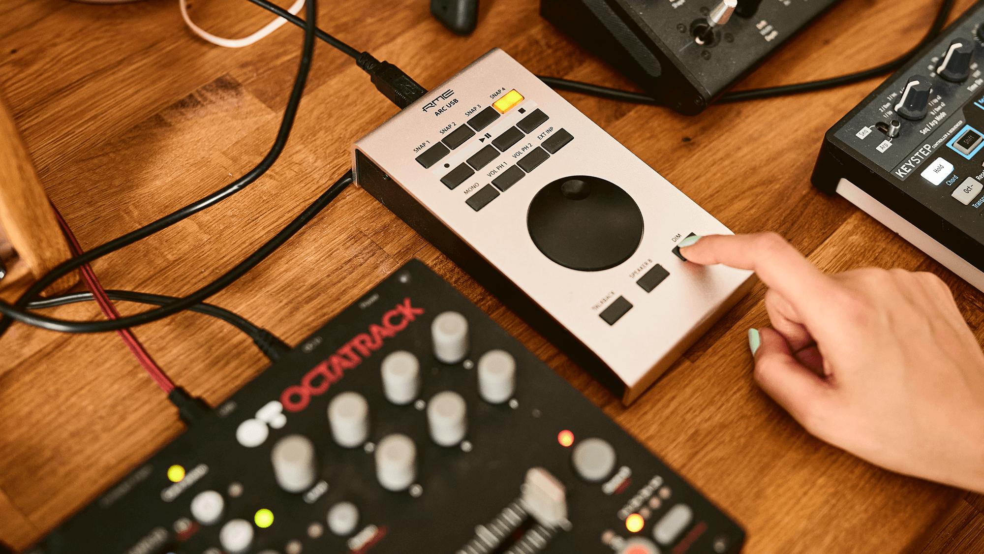 Доступний додатково пульт дистанційного керування ARC USB, що підключається до вашого комп’ютера через USB, з’єднується безпосередньо з мікшером TotalMix FX. Він має гнучко призначуваних 15 кнопок з підсвіткою, коліщатко енкодера та TS-джек роз’єм для підключення педального перемикача.
