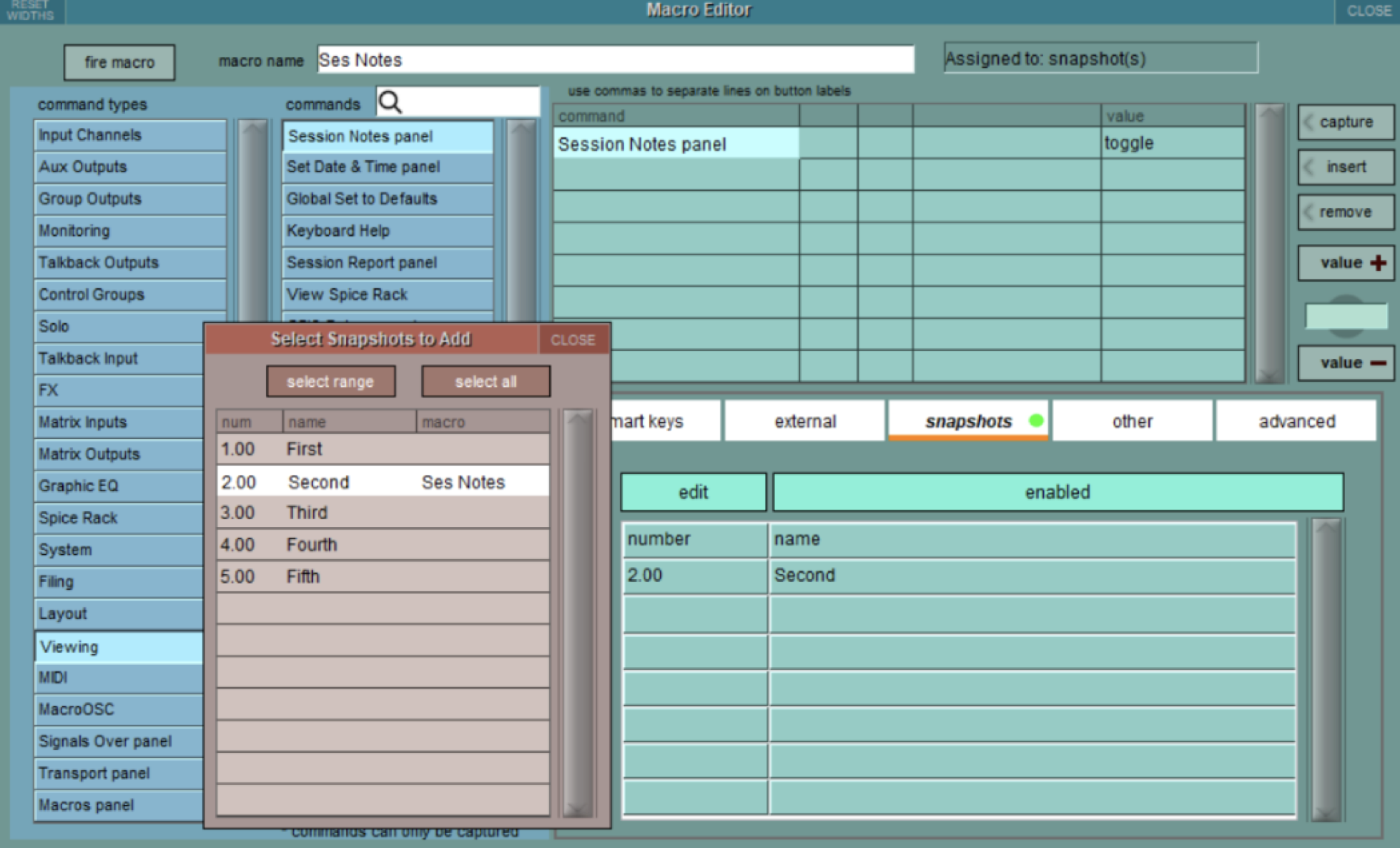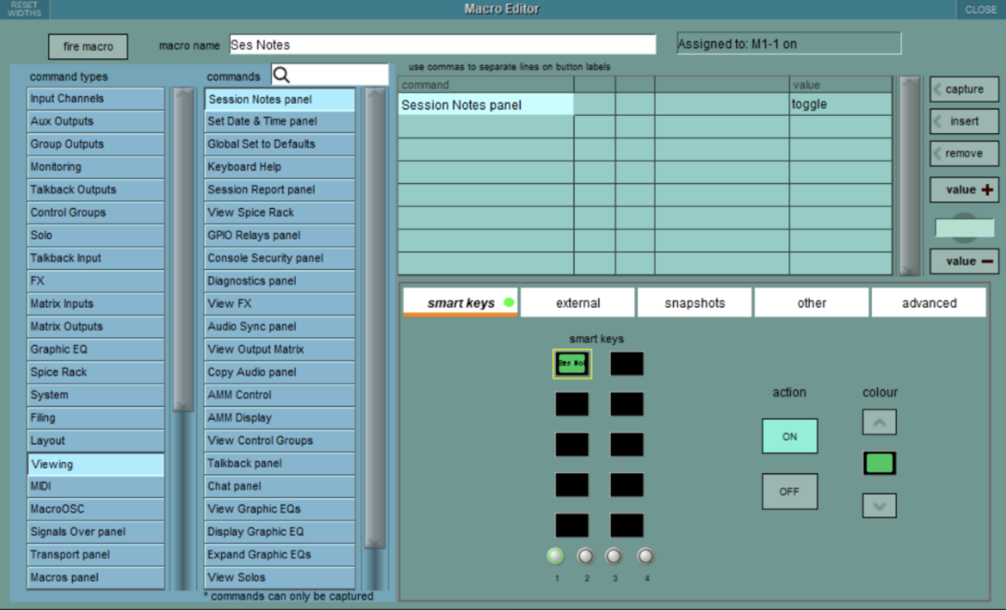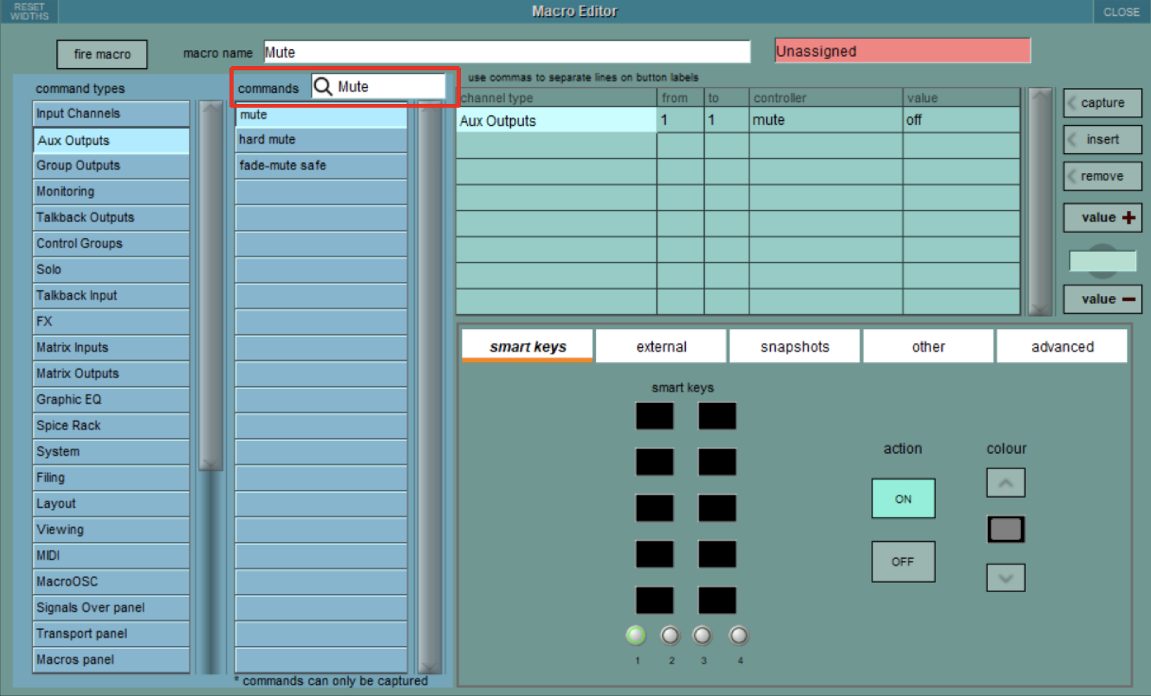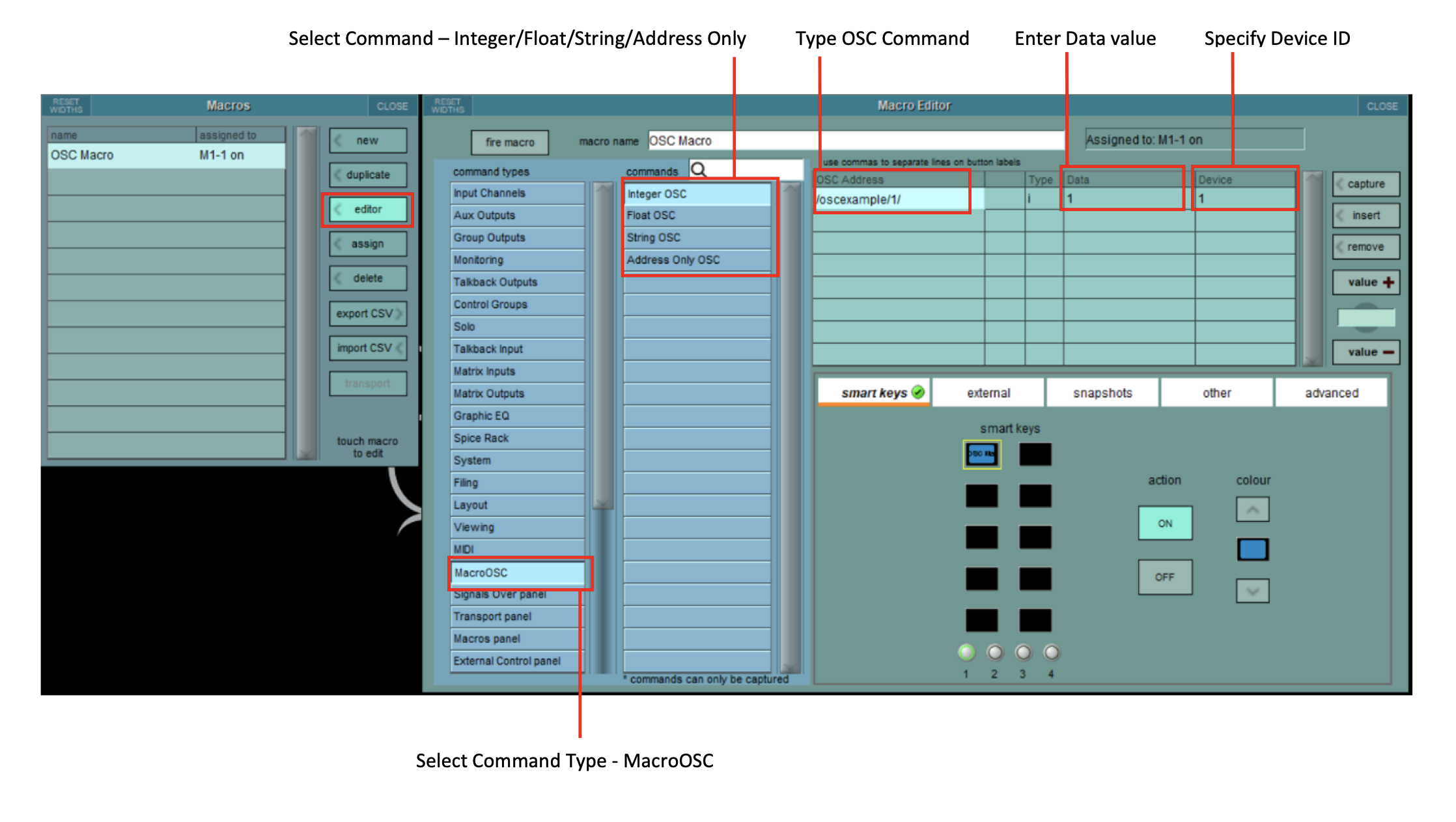 В останньому оновленні програмного забезпечення для консолей DiGiCo SD та Quantum V1926 з’явилися нові функції та параметри запуску макросів. Макроси тепер можуть запускатися певними пороговими значеннями фейдера, певними рівнями індикації, соло прослуховуванням в каналах або як частина запуску снепшотів. Панель редактора макросів “Macro Editor” була розширена новою екранною розкладкою з різними розділами у вкладках. ![]() З’явився також новий тип макросів, який називається “Macro OSC”, це дозволяє макросу передавати власні OSC-повідомлення через Ethernet-порт консолі. Серед інших доданих функцій — можливість введення глобального значення темпу вручну та підтримка блоку розширення Sound Devices A20-Opto I/O. Редактор макросів має нові розділи та вкладки, а також, крім існуючих, нові параметри запуску макросів. Вкладка розумних клавіш “Smart Keys” дозволяє призначити триґер макроса на програмовані кнопки макросів на консолі. Тут можна призначити дію кнопки (вмикання або вимикання), а також вибрати колір фону. Вкладка “External” дозволяє призначити триґер макросу для зовнішніх сигналів: GPI, вхідної OSC-команди або MIDI-повідомлення Program change. ![]() Макроси можна запускати як частину запуску снепшота у вкладці “Snapshots”. До списку триґерів будь-якого конкретного макросу можна додати один або кілька снепшотів. ![]() Примітка: будь-який снепшот може ініціювати лише один макрос, тому, якщо потрібно запустити більше макрос-функцій, потрібно створити новий макрос. Для кожного макросу можна вибрати лише один тип триґера.