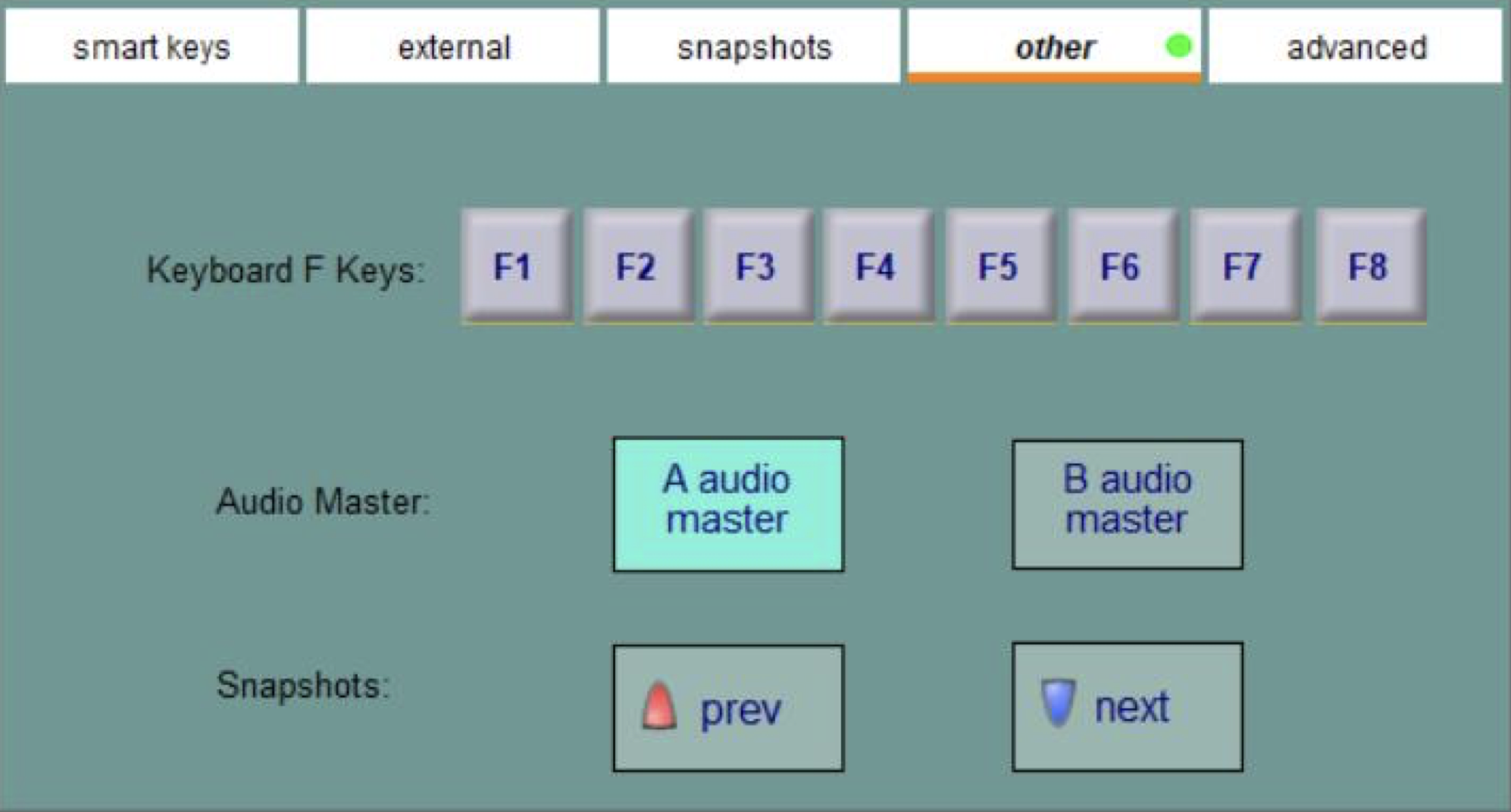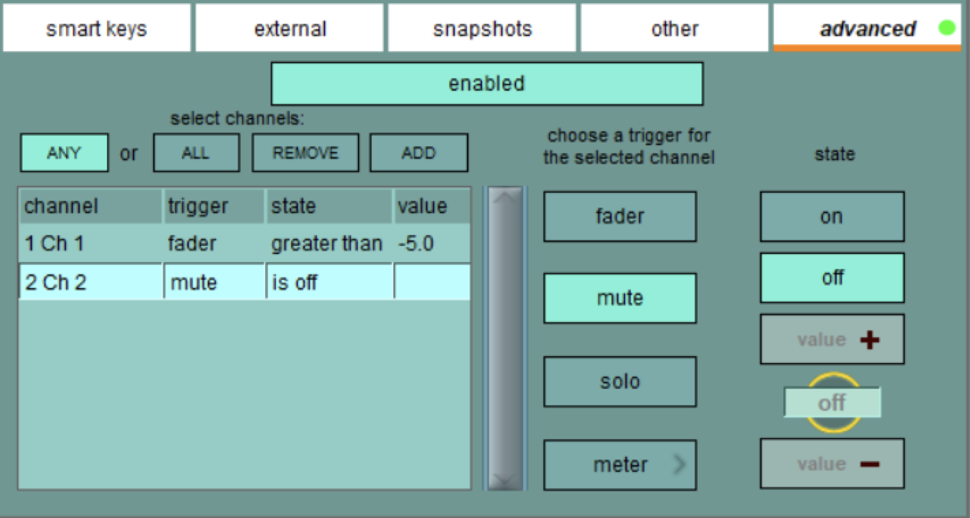 Вкладка “Other” дозволяє призначити триґер макросу на функціональні клавіші F клавіатури, на перемикач Audio Mastership A / B на консолі та на кнопки перемикання “prev” та “next” на робочій поверхні.![]() Вкладка “Advanced” дозволяє використовувати умовні триґери макросів, у яких для запуску макросу використовується статус певних елементів керування каналом або індикації. Для одного або кількох каналів можна вказати один або кілька триґерів. Якщо вибрано кілька каналів, макрос може бути запущений, якщо виконано будь-яку з умов, або всі умови. ![]() Для триґера можна обрати рівень фейдера, м’ют, соло, наявність сигналу та рівень індикації, пре- або постфейдерної. Для будь-якого заданого каналу кожну комбінацію тригера та стану можна використовувати лише один раз.