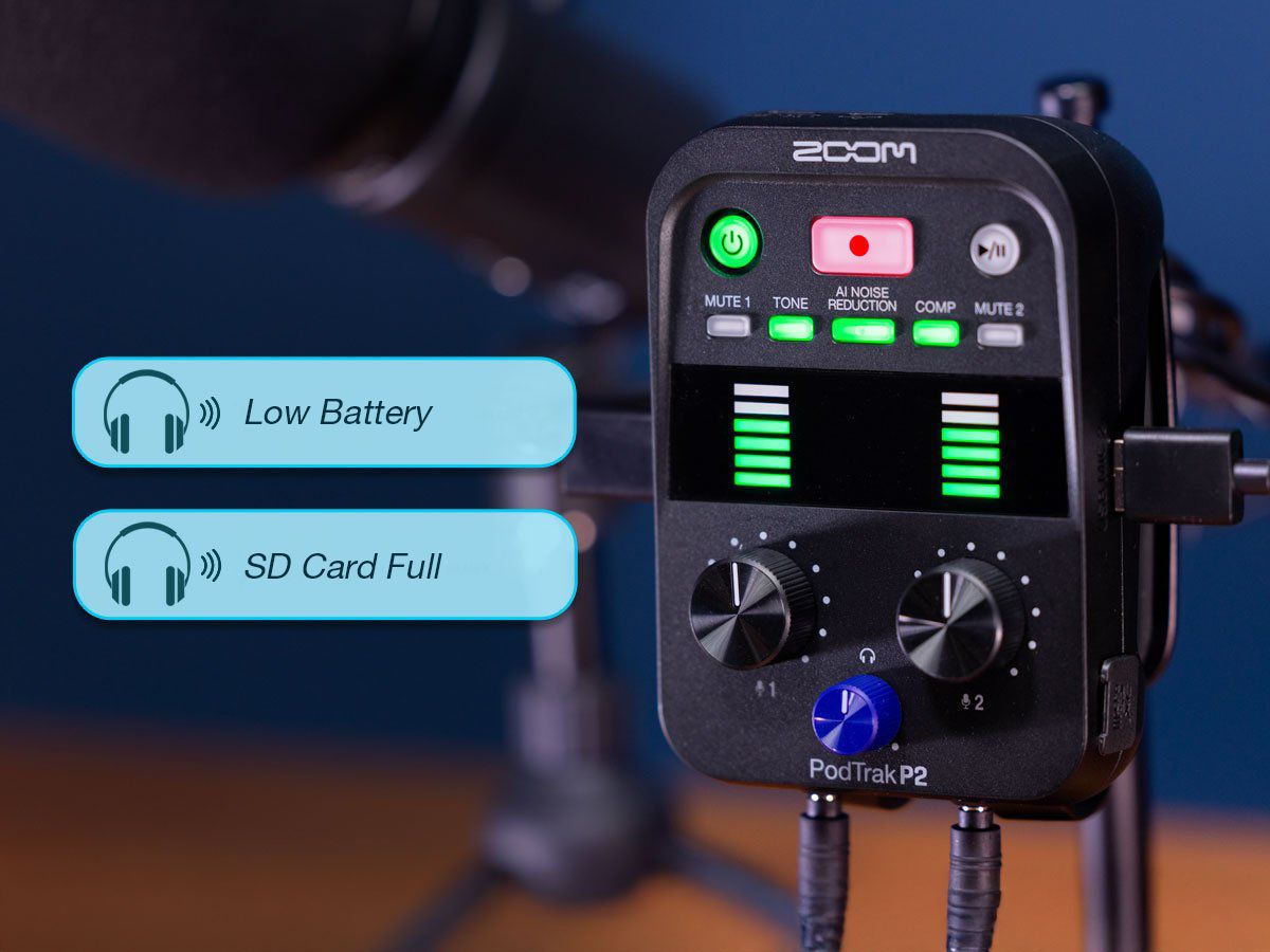 Для всіх онлайн-стримерів! Виходьте у прямий ефір з упевненістю! Проводьте трансляцію за допомогою свого смартфона чи комп’ютера, одночасно записуючи мікс на SD-карту. USB-аудіоінтерфейс Використовуйте P2 як аудіоінтерфейс для підключення двох USB-мікрофонів до свого комп’ютера, смартфона або планшета. Немає розетки? Жодних проблем! P2 може працювати до чотирьох годин від чотирьох батарейок типу АА. Також він може живитися через USB-порт від мобільного павербанка, USB-шини або мережевого блока живлення (не менше 12 Вт). ![]() Швидке мікшування або повний контроль Записуйте стереомікс для миттєвої готовності матеріалу або зберігайте окремі треки (до 4-х треків у форматі 48 кГц / 24 біти) для отримання повного контролю під час постпродакшну. ![]() Звукові сповіщення Звукові сповіщення P2 допомагають виконати необхідні налаштування та повідомляють про низький рівень заряду батарей, недостатній обсяг пам’яті чи інші проблеми через виходи для навушників, не перериваючи при цьому ваш подкаст. Не втрачайте жодного дубля! P2 автоматично зберігає ваші файли кожні 10 секунд, захищаючи всі ваші записи від переривання живлення. Супутнє програмне забезпечення P2 Програмне забезпечення P2 Editor, сумісне з ОС Windows і Mac, дає вам доступ до додаткових налаштувань запису та аудіоінтерфейсу. Zoom PodTrak P2 — почніть цікаву розмову! ![]() Технічні характеристики Вхідні та вихідні канали