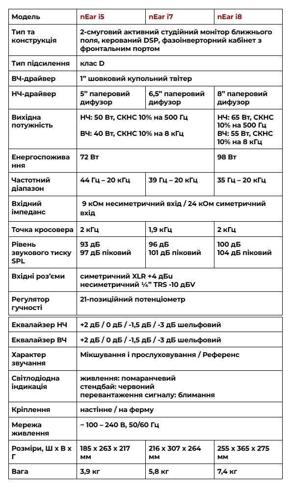 Високоефективне підсилення класу D з DSP-обробкою забезпечує надзвичайно рівну АЧХ від самих низів, а новий високочастотний драйвер із шовковою купольною діафрагмою та спеціальний низькочастотний динамік з паперовим дифузором, виготовленим з міцних та екологічно чистих волокон відтворюють звук максимально чесно, забезпечуючи неперевершену потужність у діапазоні низьких і середніх частот, пропонуючи найкращі характеристики у своєму класі. Унікальний перемикач характеру звучання пропонує плавні налаштування у положенні “Mix & Listen” для мікшування та прослуховування або прецизійний еталонний звук у положенні “Reference”. Оновлена серія nEar — це ще одна вагома віха у спадщині студійних моніторів ESI. Для музичних продюсерів, домашніх студій звукозапису, репетиційних баз та подкастингу — монітори nEar — це найкращий вибір за доступною ціною! Технічні характеристики ![]() Нові студійні монітори ближнього поля серії nEar від ESI Audio вже доступні у продажу в Україні! Лінійка представлена трьома абсолютно новими моделями референсних гучномовців ESI nEar: i5, i7 та i8, які відрізняються своїми розмірамита оснащені 5”, 6,5” та 8” НЧ-динаміком відповідно.