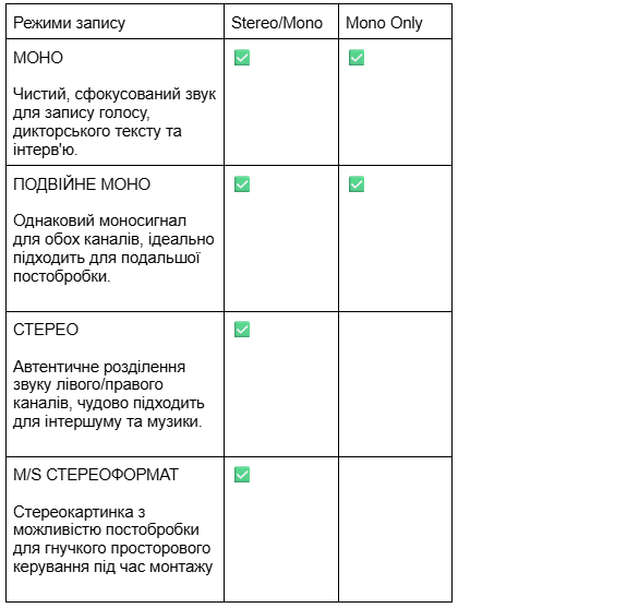 -Запис відео та аудіо на телефон у додатку (48 кГц) -Профіль Hands-Free (16 кГц) *Сумісний з будь-яким додатком, що підтримує передавання Bluetooth-аудіо через профіль Hands-Free (Facebook Live, Instagram Live, Blackmagic Camera, Filmic Pro тощо), та пристроями, такими як мобільні пристрої iOS та Android, комп’ютери Apple та Windows, Insta360 One R, Rs, X2, X3, X4, X5, Ace, Ace Pro, Ace Pro 2, GoPro 12, GoPro 13, GoPro Max 2.